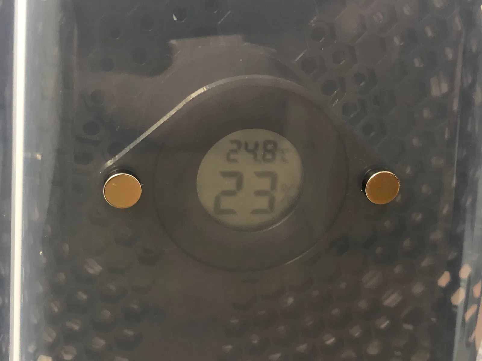Cái đế này dành cho loại ẩm kế nhiệt kế tròn của hãng EEEKit, mua trên Amazon rất dễ. Lắp ráp cực kỳ đơn giản với 4 viên nam châm 8x3mm, gài vào là xong. Ưu điểm là không để lại dấu vết, dễ dàng di chuyển. Link mua hàng có sẵn.
