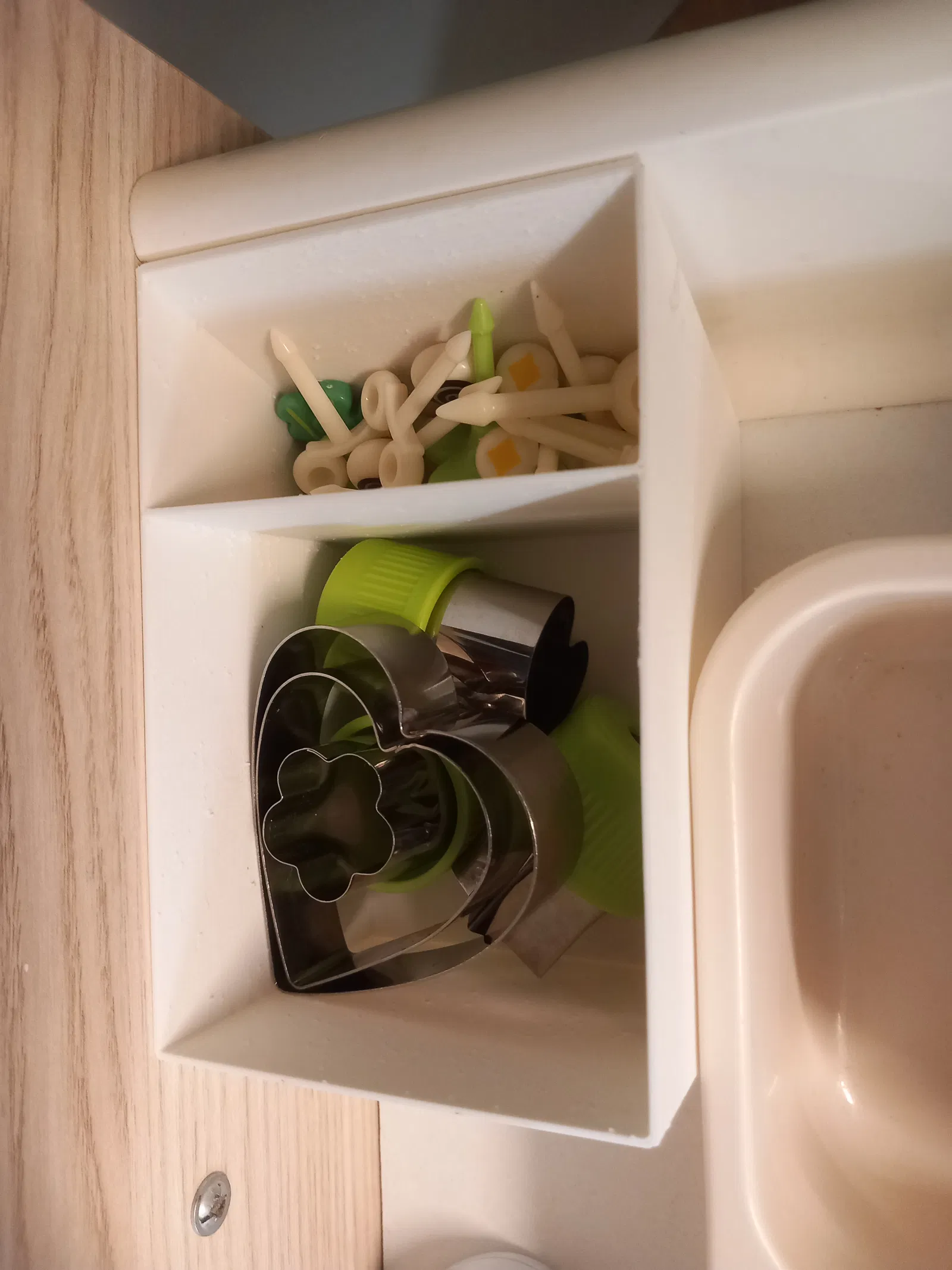 Cái hộp này được thiết kế để lấp đầy một khoảng trống trong ngăn kéo của tui, chỗ mà nó đã có sẵn khay đựng dao kéo rồi. Vì cái ngăn kéo nó có cái cạnh bo tròn bên trong nên tui có làm nghiêng một cái thành hộp xíu.