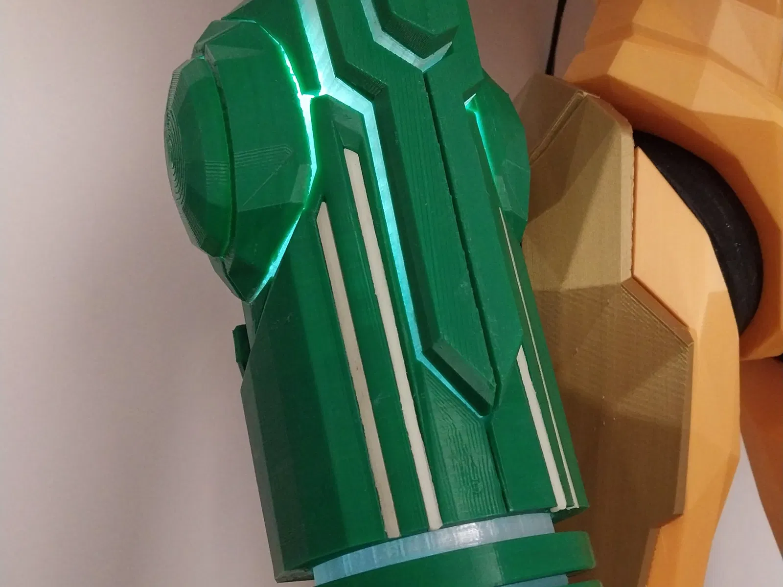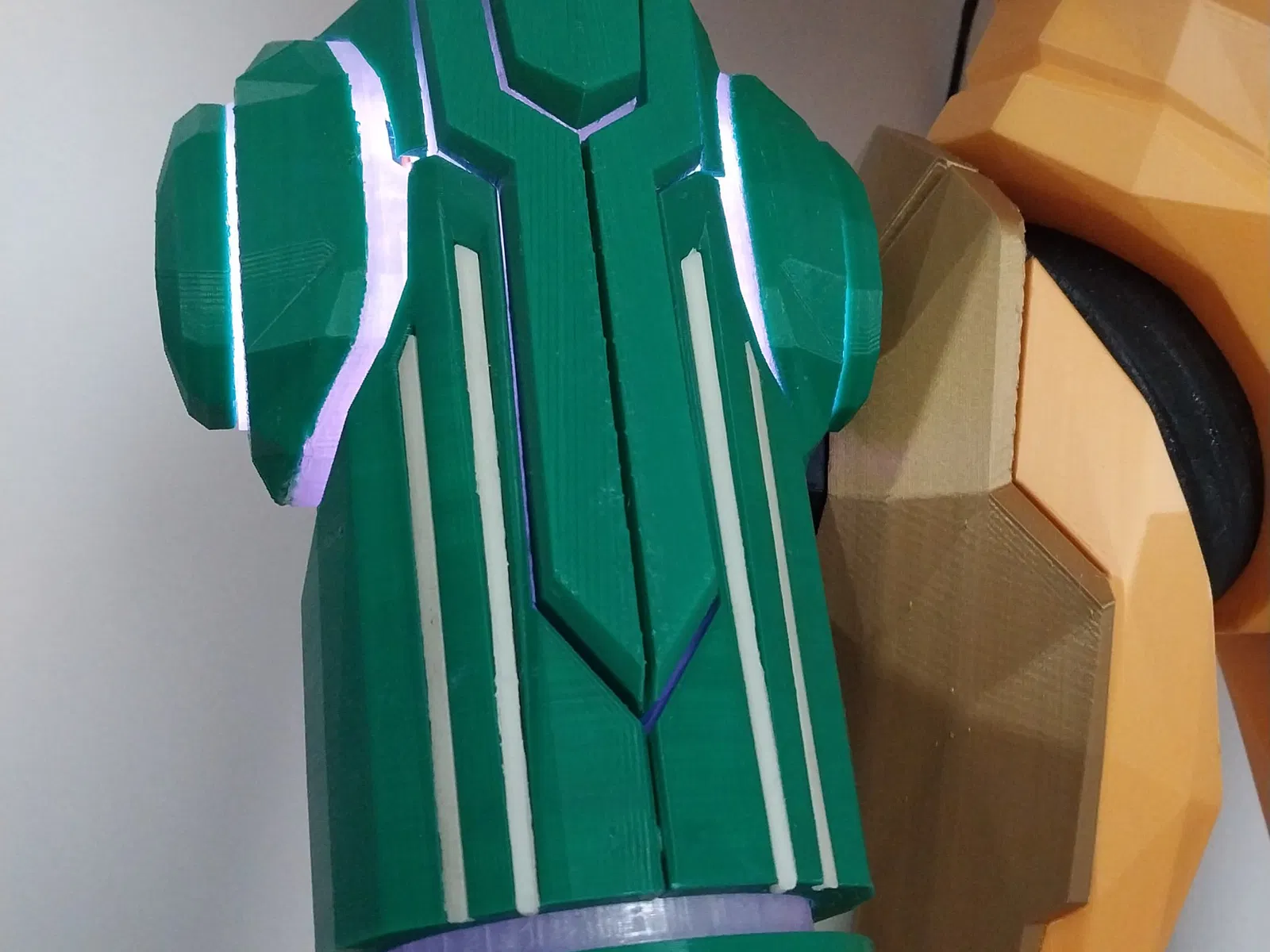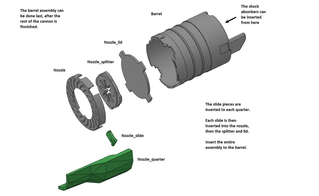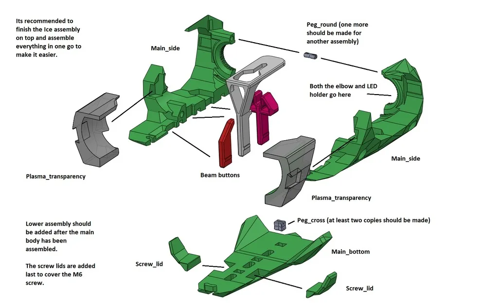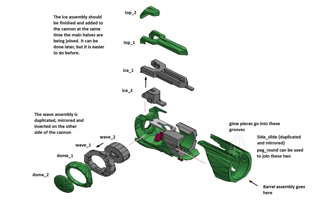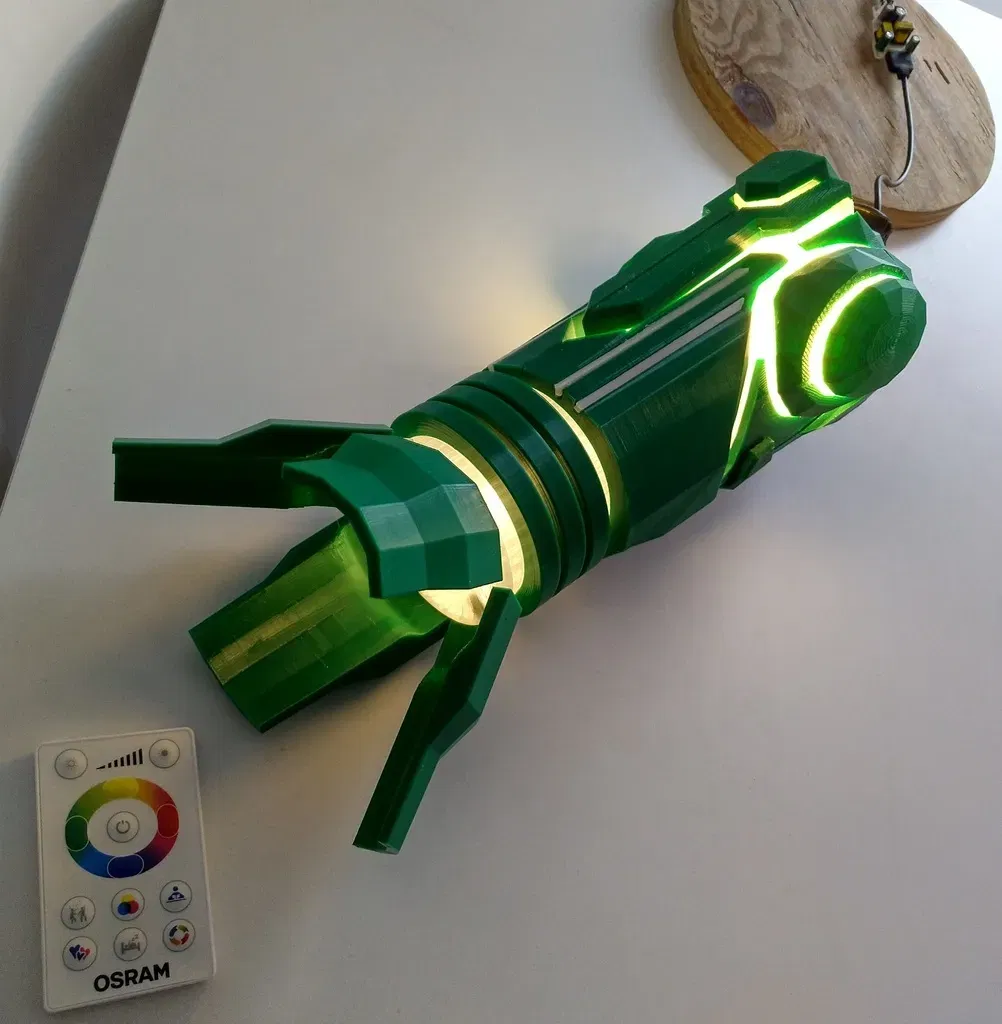 Đây là một bản sao tỷ lệ 1:2 của khẩu súng tay của Samus từ các trò chơi Metroid Prime. Khẩu súng được cấu thành từ nhiều phần để mô phỏng cách nó biến hình và thay đổi khi chọn các tia khác nhau. Ánh sáng là một đèn LED RGB mà tôi đã tháo rời và phân tách, mô hình tôi mua cần một cáp 5 pin bổ sung (dùng cho dải LED) để kết nối các đèn LED với bộ biến áp, tôi đã bao gồm vỏ mà tôi đã sử dụng để giữ nó ở vị trí nhưng YMMV tùy thuộc vào điện tử mà bạn có thể mua hoặc tự chế tạo. Bộ biến áp sẽ được giấu bên trong cánh tay của cô ấy, nhưng phần đó vẫn chưa được làm. Các nửa được giữ lại với hai ốc vít M6 x 60mm (hoặc 2 1/2") và đai ốc khóa, một ốc vít tương tự nhưng dài 50mm (2") được sử dụng cho khuỷu tay. Các phần chuyển động bằng cách sử dụng các miếng wedge đơn giản đẩy và trượt lên các miếng wedge khác, hệ thống này thừa nhận là còn xa mới hoàn hảo, và tôi dự định sẽ lặp lại điều này, và có thể thử một thiết kế mới trong tương lai. Đầu phun có thể được mở ra bằng cách xoay bộ chia trung tâm hoặc với các bản lề riêng của mỗi phần tư. Tôi đã sử dụng mỡ silicon để bôi trơn mọi bộ phận chuyển động. Khẩu súng này là một phần của một bản in lớn hơn, đó là phần còn lại của Samus tự thân (cao 1m), các tệp đó có thể được tìm thấy tại đây Các mảnh "Trong suốt" hoặc "Minh bạch" nên được in bằng filament không màu, với ít đường viền và ít phần lấp đầy để có ánh sáng tốt hơn, nếu bạn có khả năng in kép, bạn có thể in các mảnh trong suốt băng và sóng với lớp vỏ màu xanh lá cây bên trên, nhưng tôi chọn dán chúng bằng silicone lỏng. Các mảnh "phát sáng" nên được làm bằng filament "phát sáng trong bóng tối" màu xanh lá cây hoặc vàng. Mọi thứ khác có thể được làm bằng màu xanh lá cây (bạc cũng là một lựa chọn tốt), với màu tùy chọn cho các nút tia. Phần che khuỷu tay nên được làm bằng filament màu vàng, PLA lụa sẽ rất tuyệt nhưng hãy nhớ rằng bức tượng này sẽ khá lớn, có thể muốn chọn thứ gì đó rẻ hơn hoặc chỉ sơn nó. Các bộ phận này phải được nhân đôi và phản chiếu trong máy cắt: main_side plasma_transparency screw_lid ext_dome_1 ext_dome_2 wave_transparency_1 wave_transparency_2 side_slide glow_short glow_long LED_lampPCB_holder (không cần phản chiếu) Các bộ phận này phải được in 4 lần: nozzle_slide nozzle_quarter Cả hai loại chốt nên được nhân đôi ít nhất một lần. Mọi thứ khác được in một lần. Mô hình được trích xuất từ Metroid Prime 3 sử dụng Metaforce. Cập nhật 1: Tăng cường nozzle_slide để làm cho lắp ráp ít bị lung lay hơn, các mảnh nozzle và nozzle_quarter cũng đã được chỉnh sửa vì lý do đó. Cập nhật 2: Bao gồm hướng dẫn lắp ráp mới trong tệp PDF. Cập nhật 3: Đã thêm một vài bộ phận nhóm lại, và thay thế các mảnh sau bằng các phiên bản mới: main_side side_slide ext_dome_1 ext_dome_2 nozzle_quarter wave_transparency_2