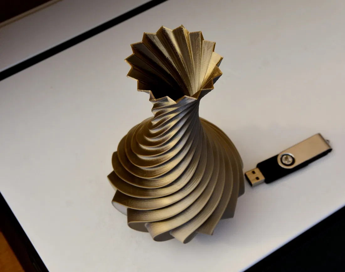 Ảnh chụp bình được in bằng chế độ "vase mode". Bạn có thể in bằng "vase mode" hoặc chế độ thường với 0 lớp trên, 0% infill, 1 hoặc nhiều lớp tường và 3 hoặc nhiều lớp đáy. File STL là dạng khối đặc. In bằng cả hai chế độ đều cho kết quả tuyệt vời.
