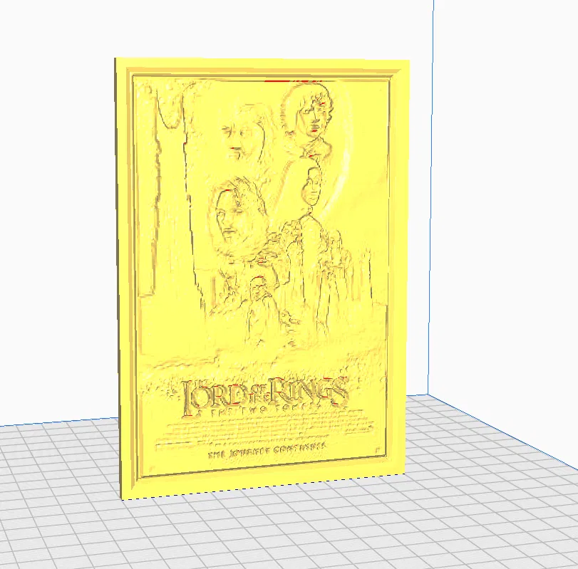 Một ảnh lithophane độc đáo của poster phim "Chúa Tể Những Chiếc Nhẫn: Hai Tòa Tháp". In bằng PLA hoặc PETG với cấu hình tối ưu để có chi tiết sắc nét và hiệu ứng ánh sáng tuyệt vời.