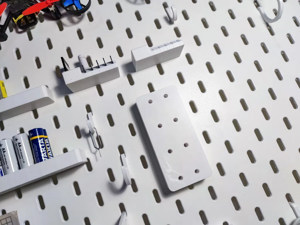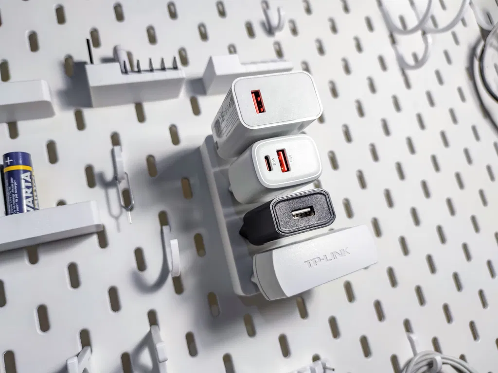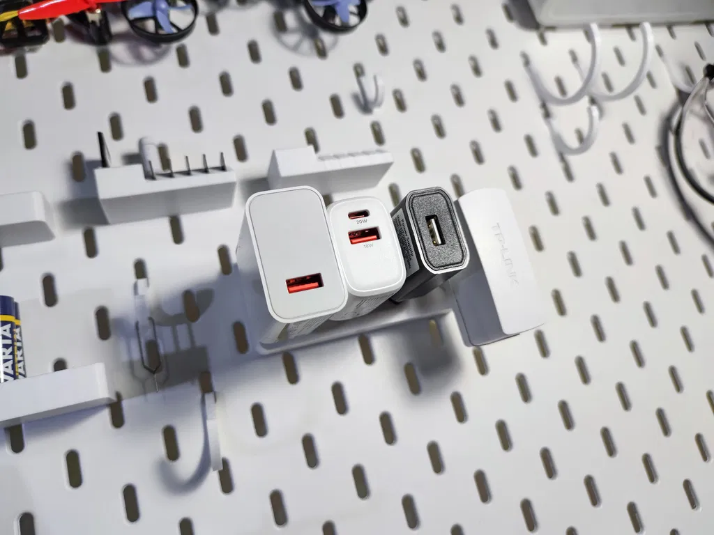 Giá đỡ siêu đơn giản cho 4 củ sạc dẹp 2 chấu EU. Mẫu này xài được cả treo dọc lẫn treo ngang, tha hồ sắp xếp đồ đạc gọn gàng trên bảng IKEA Skadis.