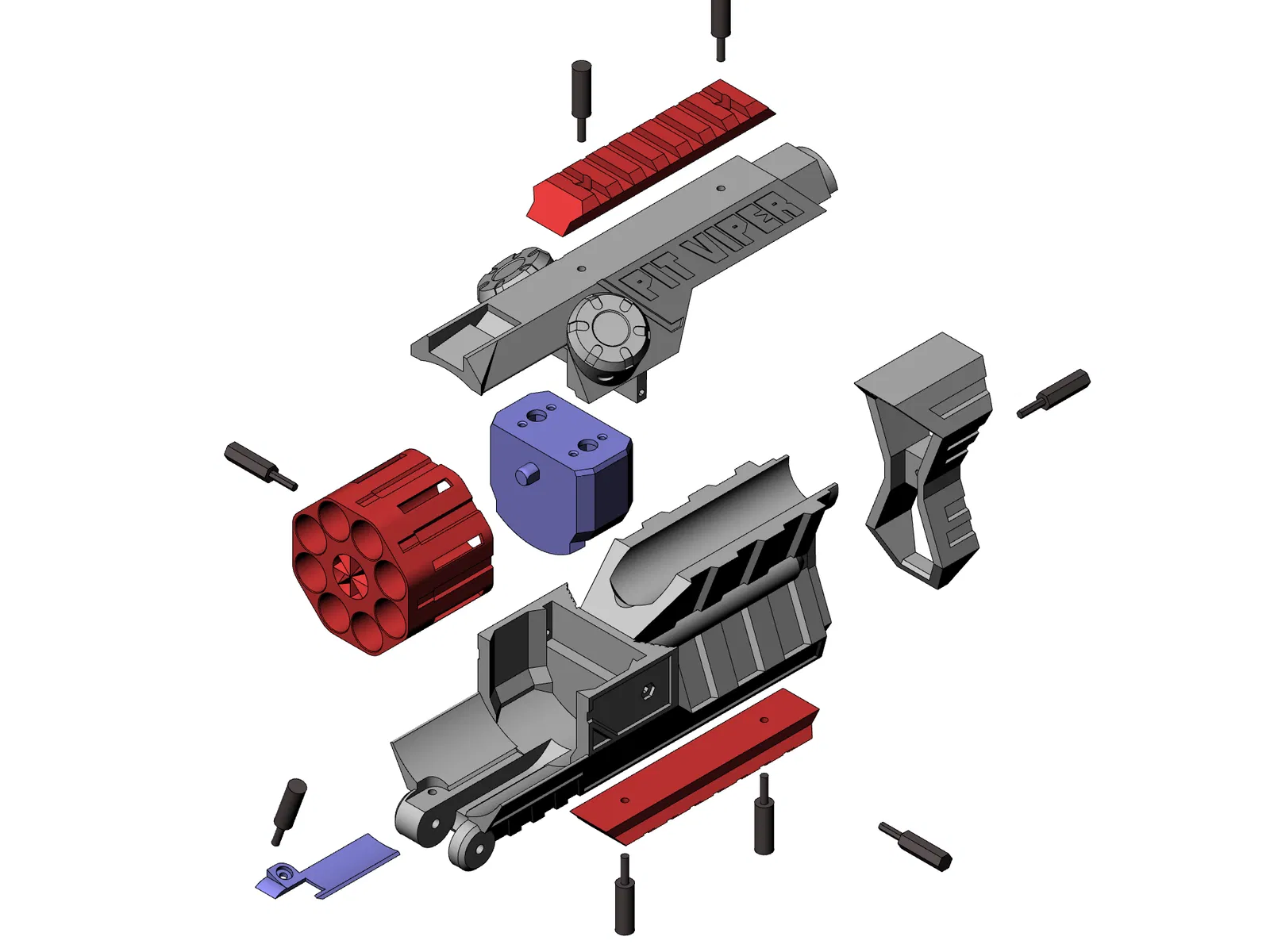 FR-1P | Pit Viper | Mũi Viper làm lại là phiên bản nâng cấp của FR-1 Viper flywheel revolver, với thiết kế hầm hố hơn. Bản cập nhật V2 bao gồm lồng động cơ dễ lắp đặt, các bộ phận được tối ưu hóa và trống mới. Phù hợp với dart nửa cỡ, yêu cầu hỗ trợ in ở một số vị trí nhất định.