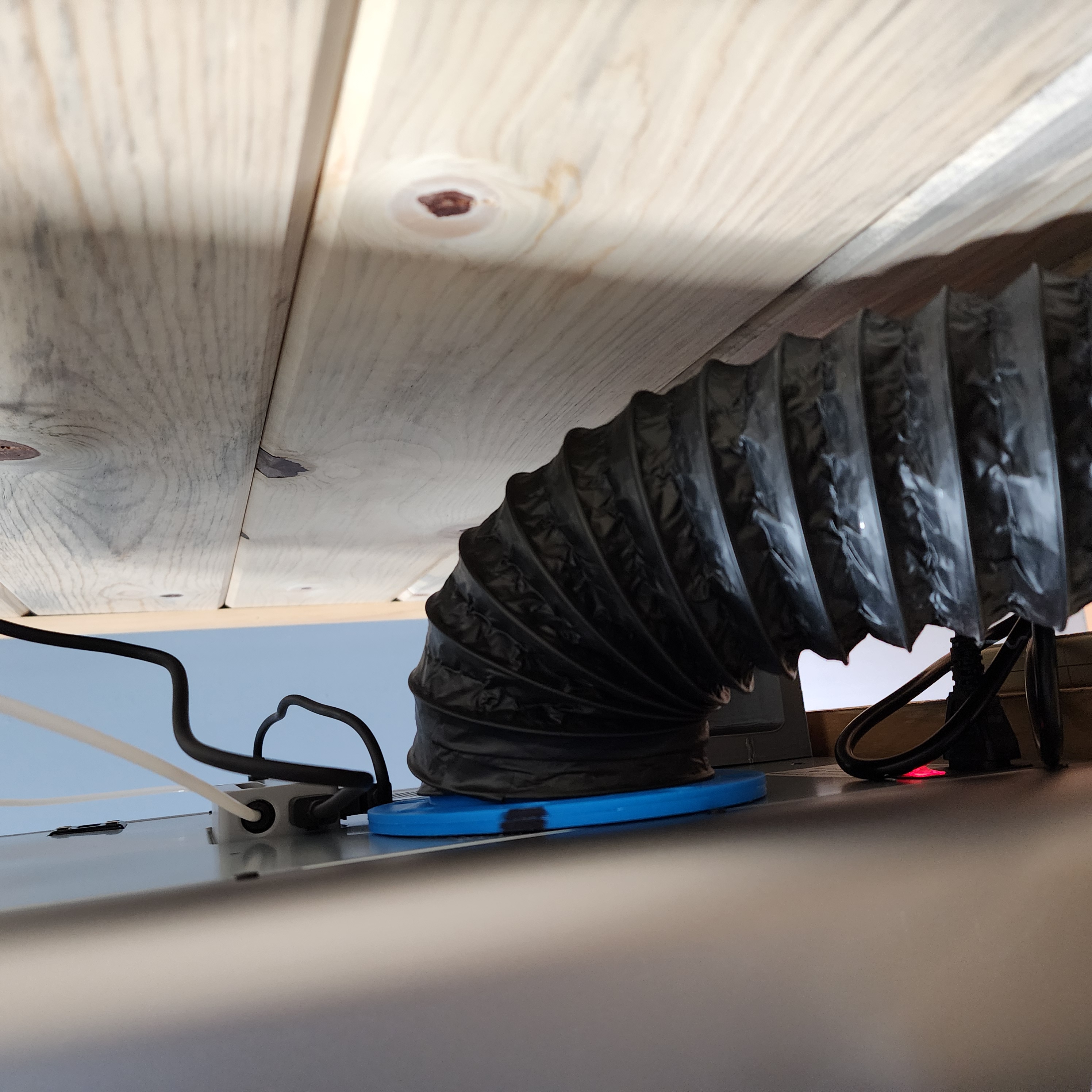 Cuối cùng, tui dùng băng keo trong hai mặt Gorilla tape để dán khớp nối phẳng vào cổng quạt hút của máy in, dán băng keo vô mặt vòng tròn nơi bạn có thể thấy mấy cục nam châm. Tui đã xài hệ thống này hơn 1 năm nay mà không có vấn đề gì.