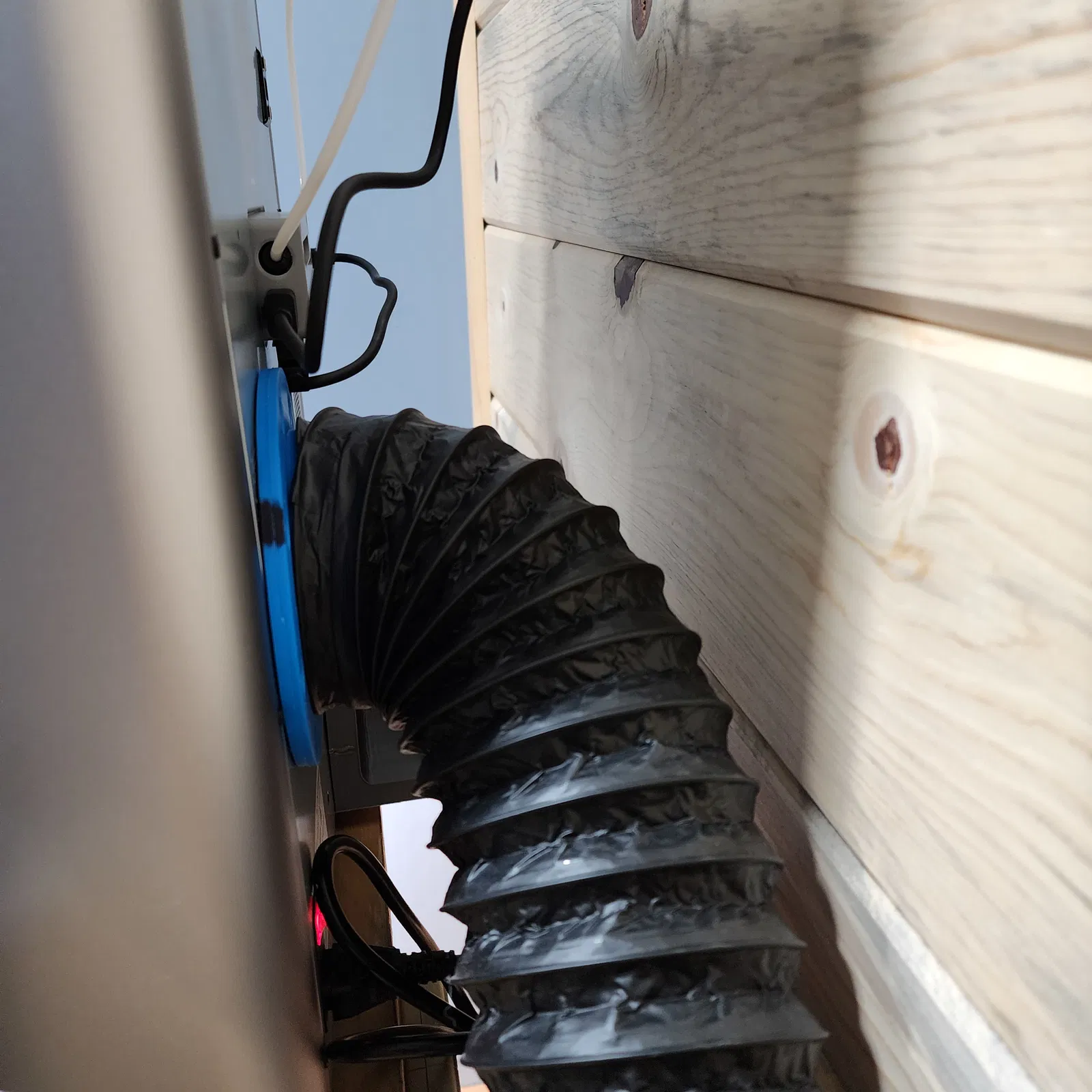 Cuối cùng, tui dùng băng keo trong hai mặt Gorilla tape để dán khớp nối phẳng vào cổng quạt hút của máy in, dán băng keo vô mặt vòng tròn nơi bạn có thể thấy mấy cục nam châm. Tui đã xài hệ thống này hơn 1 năm nay mà không có vấn đề gì.