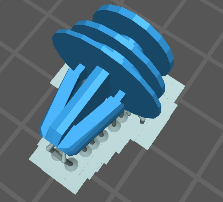 Đối với máy in FDM, bạn có thể cần sử dụng hỗ trợ cây, HOẶC thử đặt mô hình nằm nghiêng, thả Z qua mặt bàn in, và in với các trụ bên trong nằm trên bàn in, cắt bỏ khoảng ~40% mặt bên của kẹp.