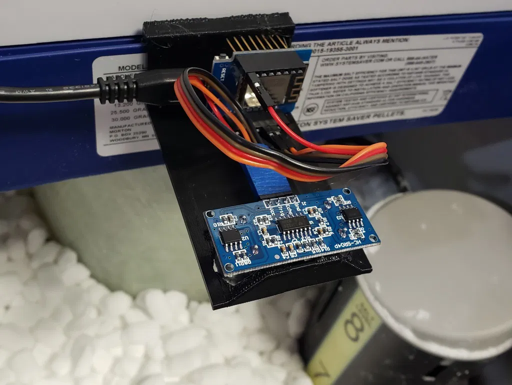 Cập nhật ~1 năm: Thật không may là tôi chưa bao giờ thiết kế nắp đậy hoàn chỉnh, và muối cuối cùng đã làm hỏng các tiếp điểm giữa Wemos D1 mini và cảm biến siêu âm. Lần tới, tôi có lẽ sẽ đặt D1 mini vào trong hộp điều khiển của máy làm mềm nước, chạy dây từ đó, và che chắn mạch của cảm biến siêu âm tốt nhất có thể bằng keo silicone.