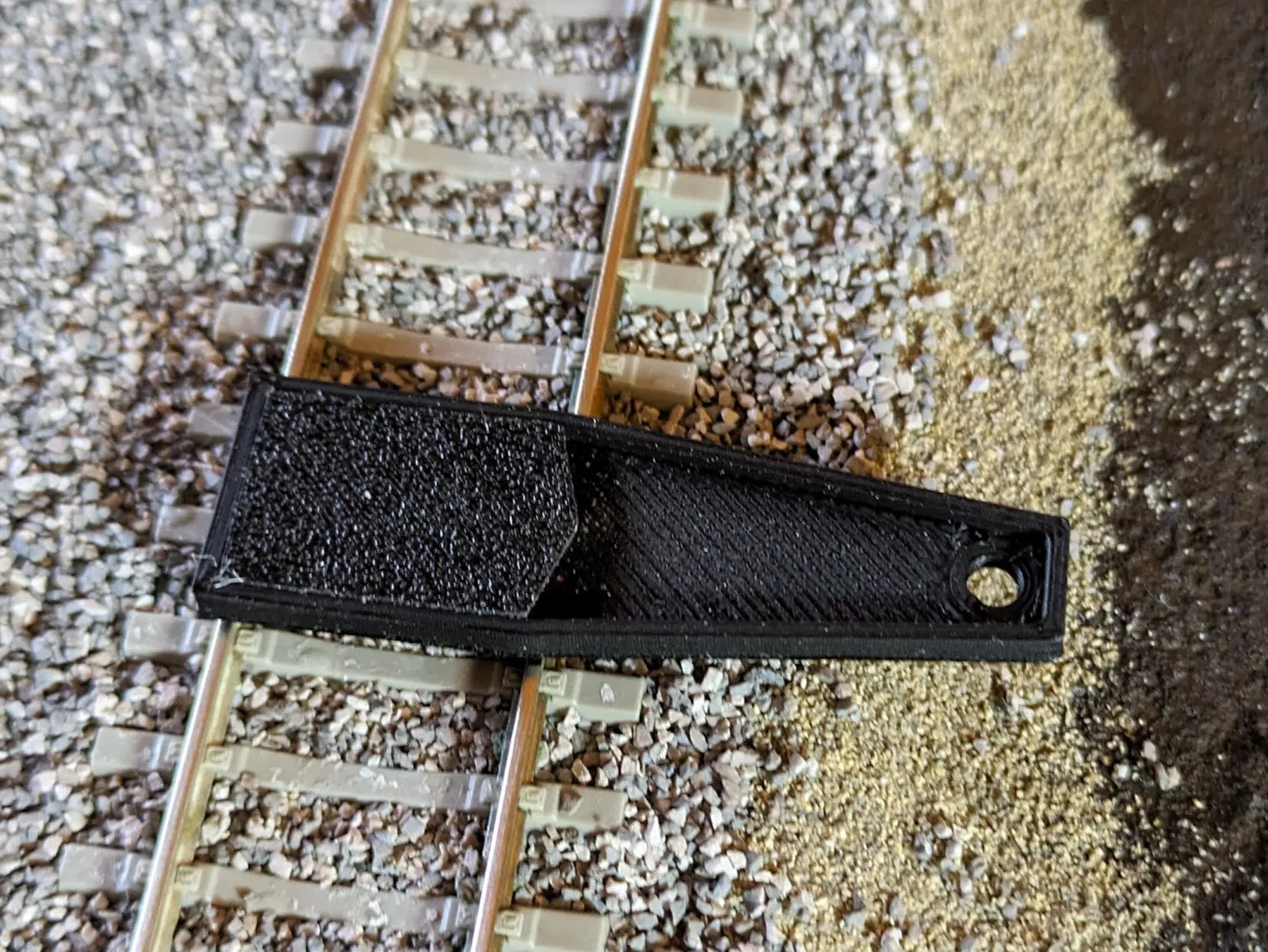 Cái jig đơn giản để tìm khoảng cách chính xác cho cột điện (mast) trong khổ H0 (ví dụ: cho cột Sommerfeldt, được đặt cách tâm ray 34 mm).
