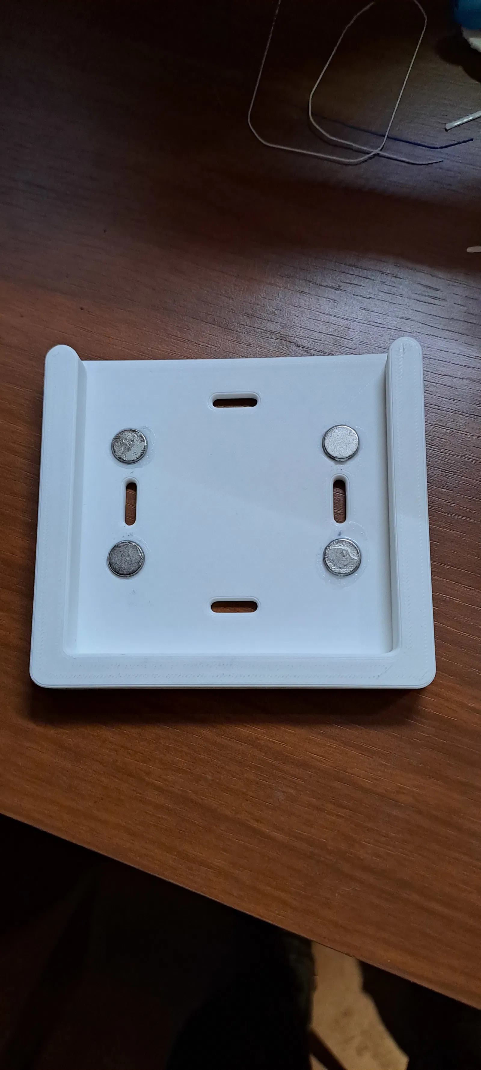 Tôi tạo khung này vì công tắc gốc giữ không chắc chắn. Tôi cũng đã tạo một nhãn ghi chú cho khung này. Tôi đã nhập các ghi chú nhãn vào PrusaSlicer và sử dụng trang web https://www.svgrepo.com/ làm nguồn. Trước khi dán nam châm, tôi khuyên bạn nên đặt thử nam châm vào công tắc và đánh số để đảm bảo đúng cực tính, xem ảnh. Nam châm đã sử dụng có kích thước 10x2 mm.