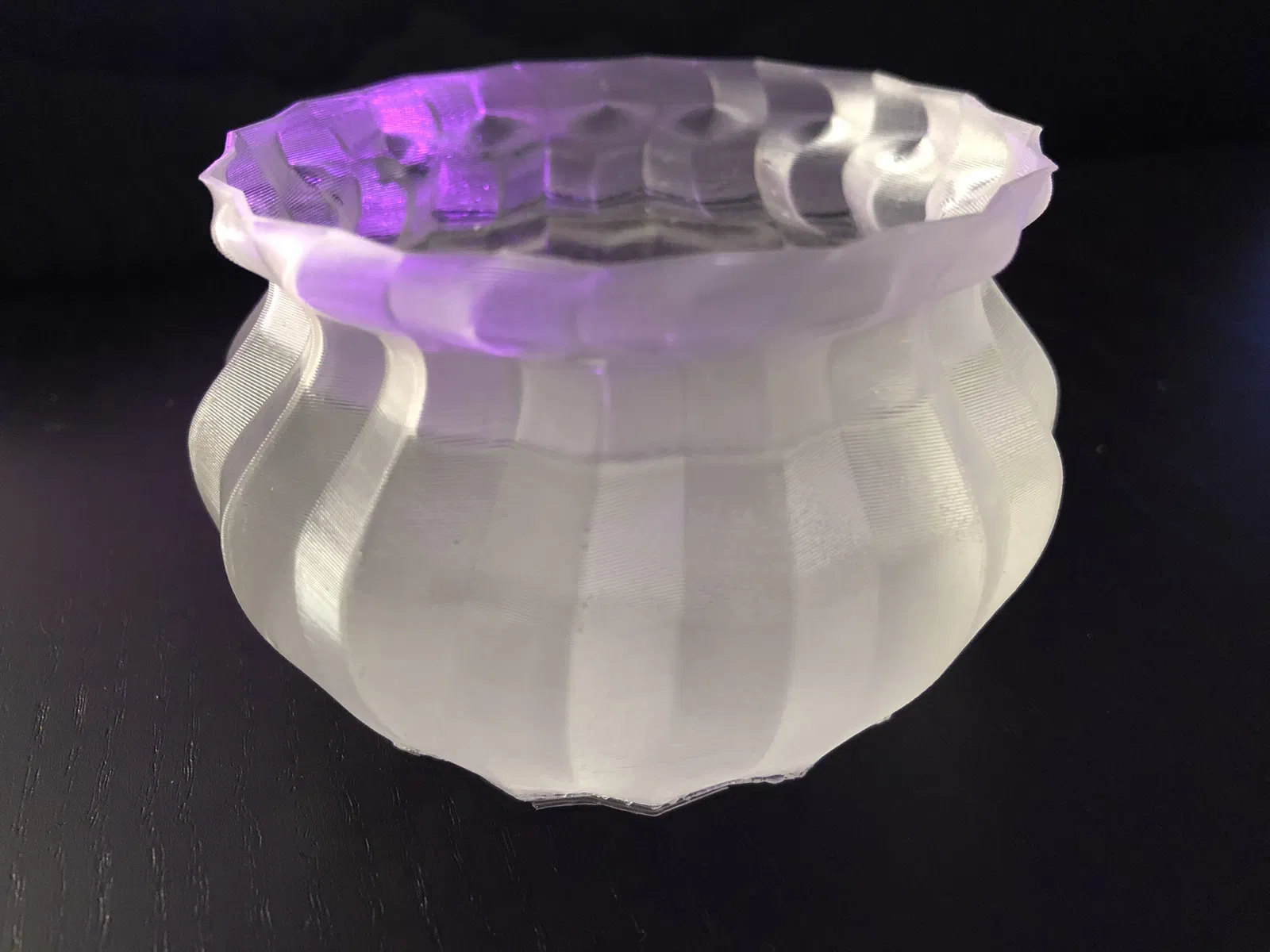 File GCODE chứa mô hình ở chế độ lọ hoa với kích thước X 100mm, Y 100mm, Z 60mm. Độ dày và dòng chảy của thành ngoài là 0.65mm 150%, đáy chậu là 1.08mm, lớp đầu tiên là 0.28mm.