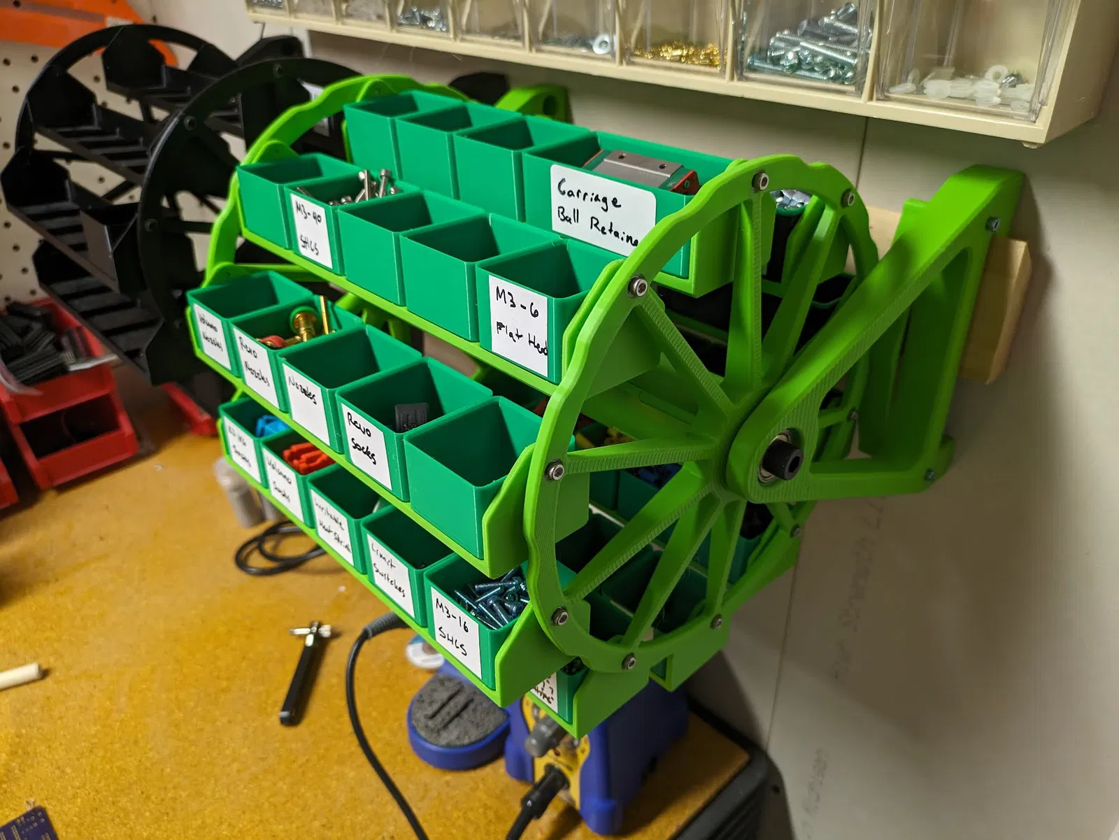 Khay xoay Gridfinity giúp sắp xếp các bộ phận nhỏ và ốc vít, có thể treo tường bằng French Cleat hoặc để bàn. Tương thích với module Gridfinity 1xN cao tới 4u. Lắp ráp đơn giản với vật liệu in và các bộ phận đi kèm.
