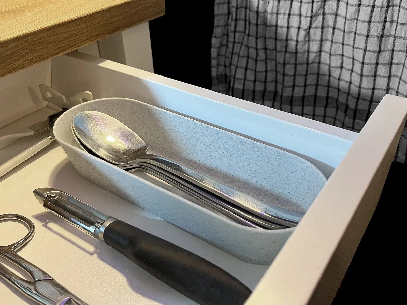 Chiếc hộp đựng dao dĩa thanh lịch, có lỗ thoát nước, mang phong cách tối giản, thích hợp cho nhà bếp. Chất liệu Prusament PLA Marble Grey tạo vẻ sang trọng, thời trang.