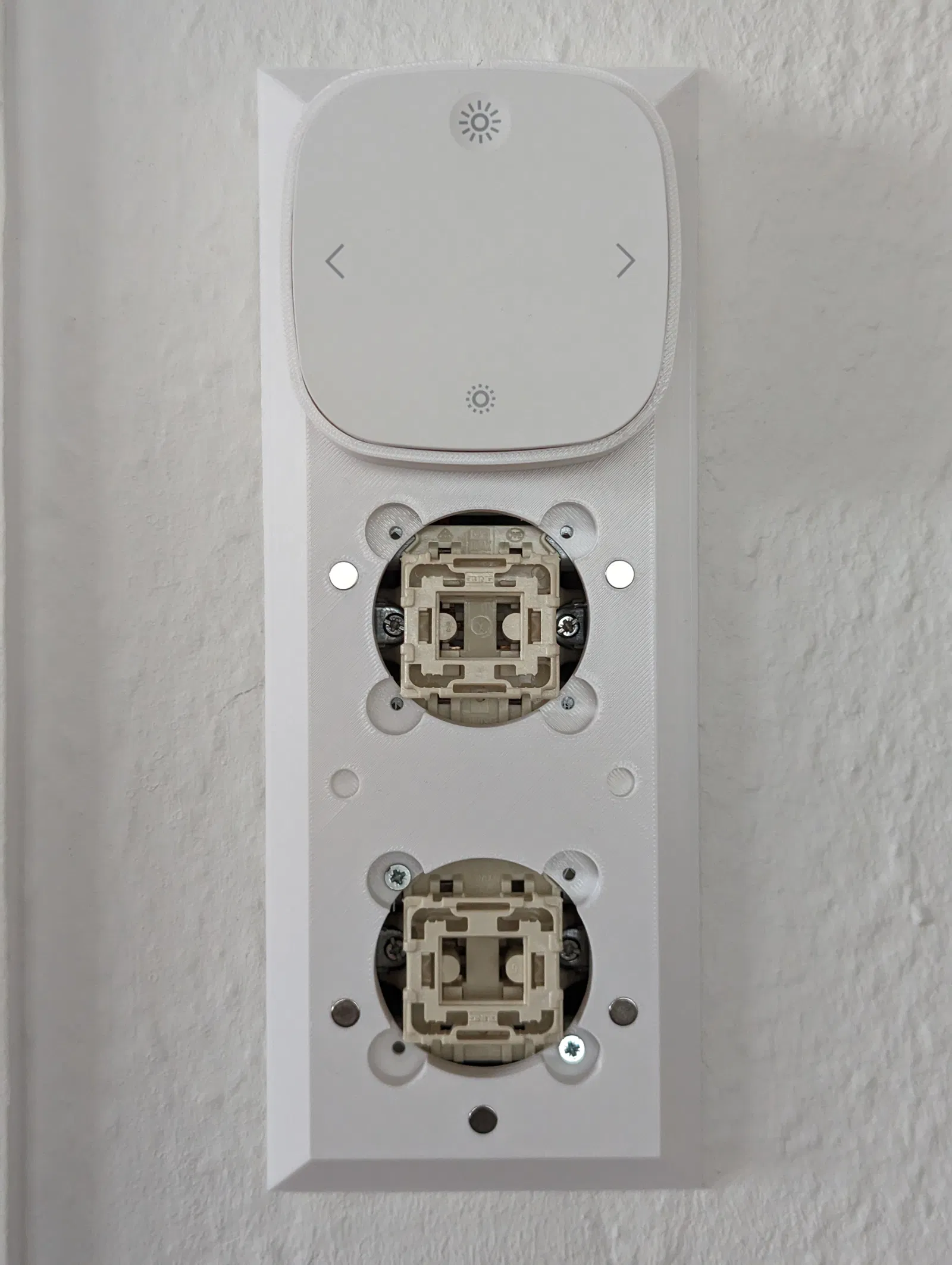 The IKEA STYRBAR holder can be easily attached using screws. I have JUNG wall switches, but if other manufacturers also have the 4 holes in the wall switch, it should also be possible to mount it.