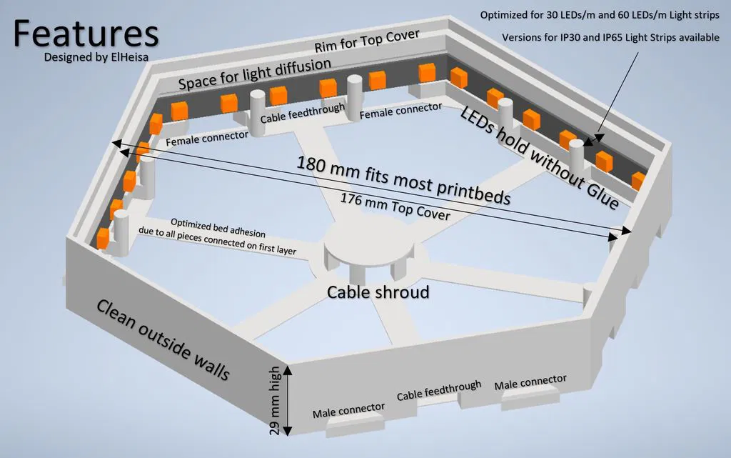 + Tán sáng tốt hơn Mấy cái tấm đèn được chiếu sáng đồng đều + Thiết kế cover Muốn cover trơn hay có tí nhấn nhá nè? Để sự sáng tạo của mấy bạn bay cao bay xa nha. + đủ kiểu sắp xếp tấm đèn Muốn 5 hay 50 tấm đèn cũng được, thiết kế này cân hết. + Bền lâu dài Dây LED được giữ chắc chắn không cần keo dán, đỡ phải dán lại hoài. + Dễ kết nối Mấy tấm đèn gắn khớp với nhau không cần keo hay thêm bộ phận gì hết. + Không dây lằng nhằng Dây điện được quản lý gọn gàng với mấy cái chụp dây. + Nhìn ngoài gọn gàng Không có lỗ hay đầu nối thừa thãi bên ngoài chỗ mấy bạn sắp xếp đèn. - Tính toán trước, in sau Do đầu nối mỗi miếng khác nhau, nên phải tính toán cách sắp xếp trước khi in. - Thời gian in lâu Mấy tấm đèn này chi tiết nên in lâu hơn mấy thiết kế khác. - Đừng scale Các tấm đèn được thiết kế theo độ dày và khoảng cách của Dây LED. Nếu scale sẽ làm dây LED không vừa. - Hàn nối Cần có kỹ năng hàn cơ bản.
