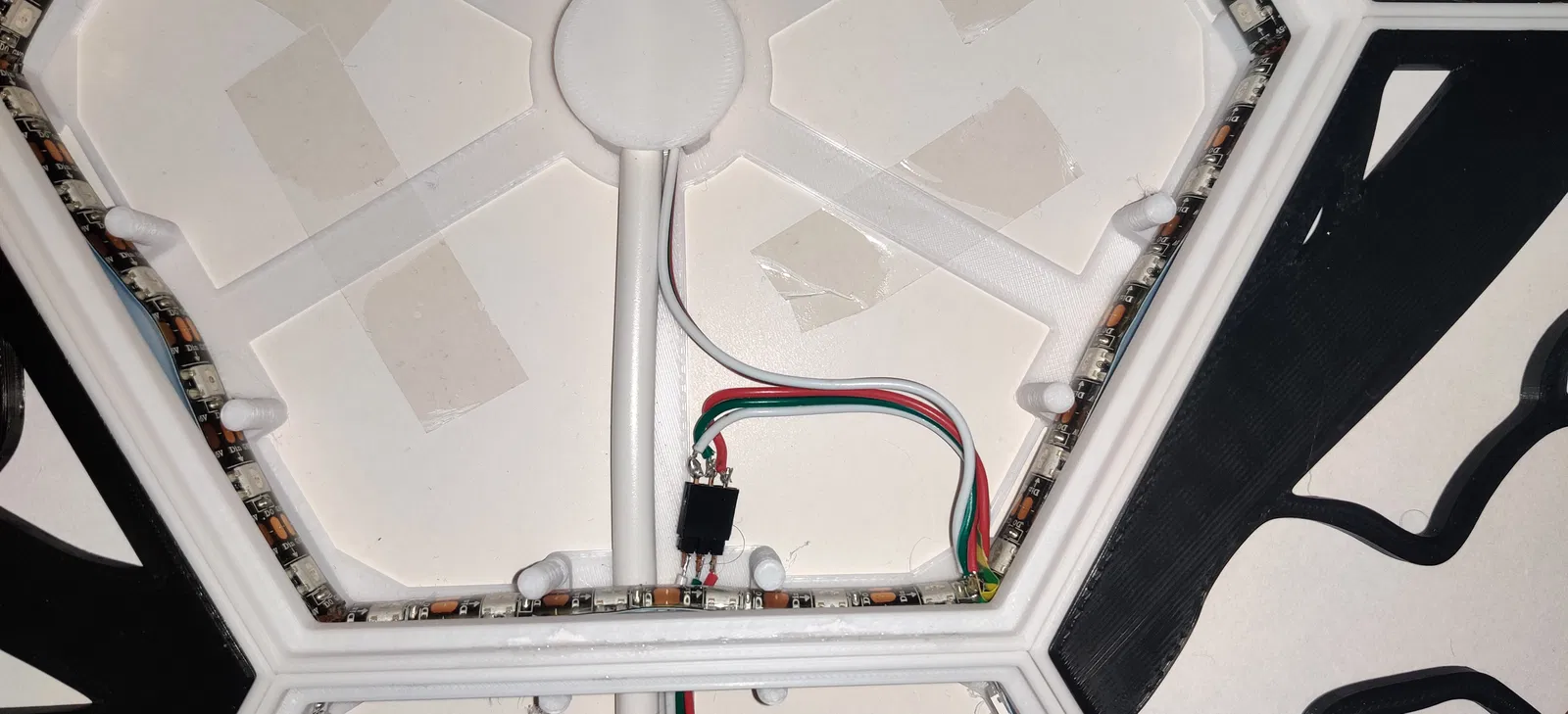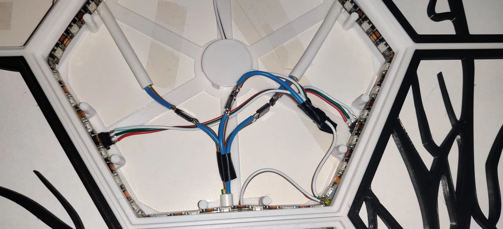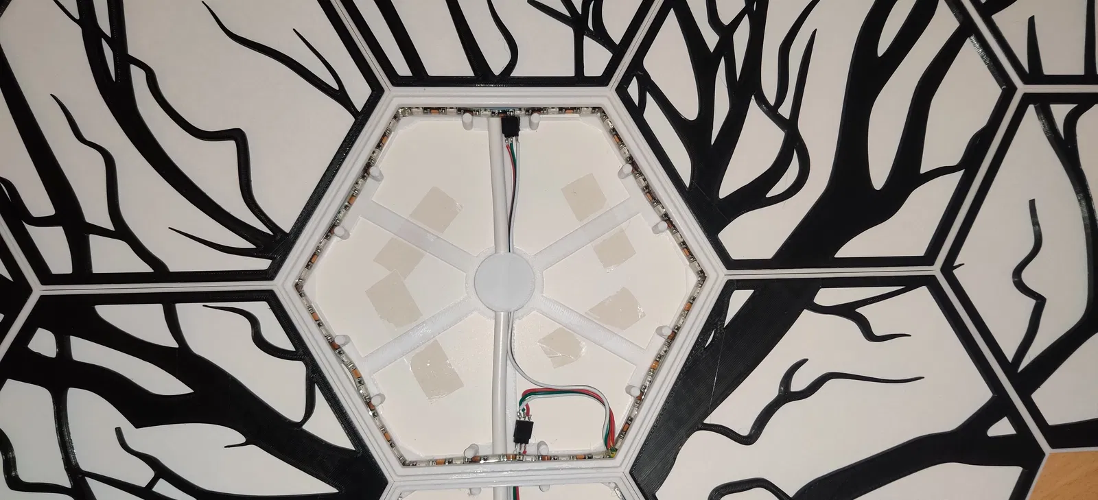 Tao đã dán băng keo cho chỗ sắp xếp Hexaleaf lên một miếngbìa cứng và tạo một vài lỗ trên bìa cứng để treo lên tường. Không cần bìa cứng cũng được, nhưng nó cũng giúp giảm thiểu ánh sáng lọt ra ngoài tường.