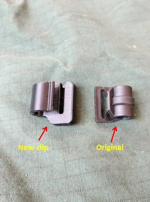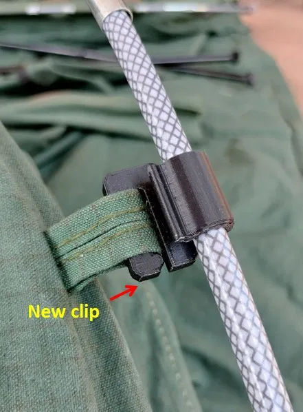 Mấy cái kẹp trên cái swag của tôi bị gãy hoài nên tôi thiết kế cái mới, gia cố thêm chỗ cần thiết. Cái kẹp zin được may vô khoen vải nên tôi không làm cái mới giống hệt được. Thiết kế này cho phép gắn cái kẹp mới vô khoen vải có sẵn và nó cứng cáp bất ngờ lắm đó, mặc dù ở chỗ đầu gắn vô nó có hở ra.