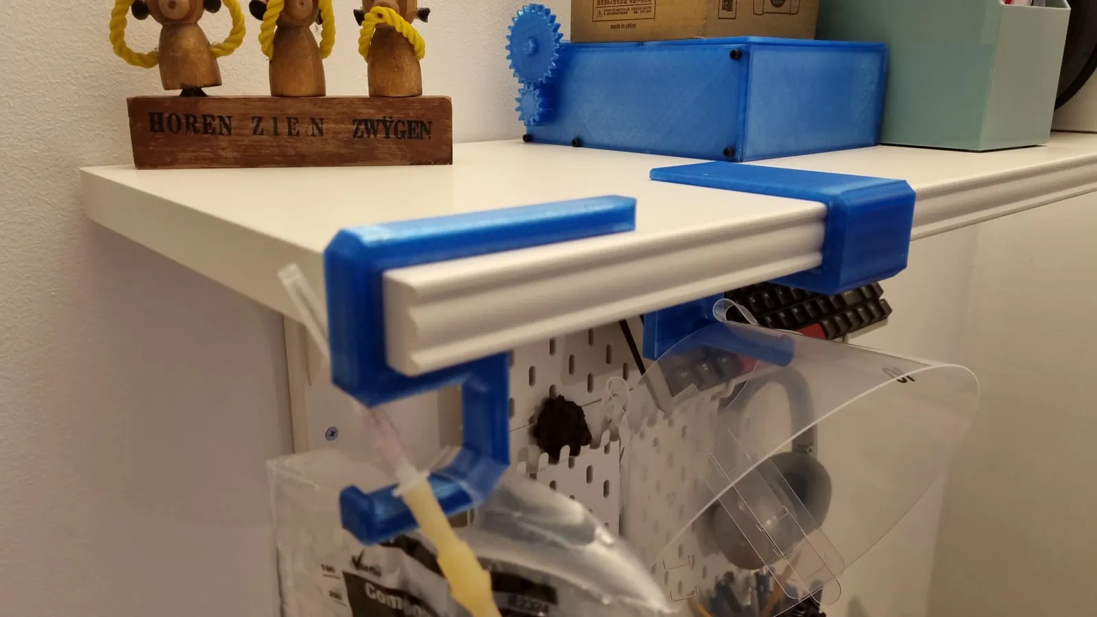 Nếu bạn có một kệ khác, hãy chỉnh sửa tệp f3d và cập nhật ShelfWidth và đừng quên bao gồm dung sai - đối với tôi, chiều rộng kệ là 25mm và dung sai máy in là 0,5mm nên tham số được đặt thành 25,5mm