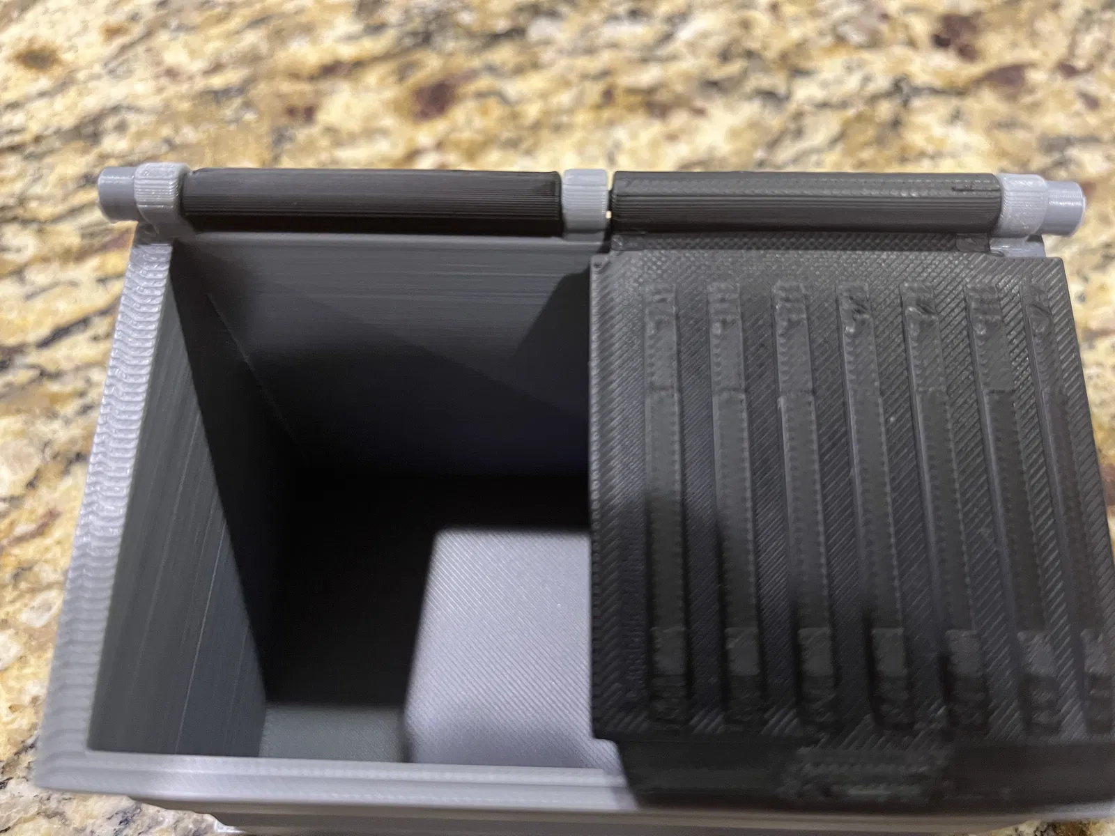 Đây là một bản lề in được cho thùng rác để bàn. In thẳng đứng với vành lớn. Dán nắp lên sau khi lắp đặt.