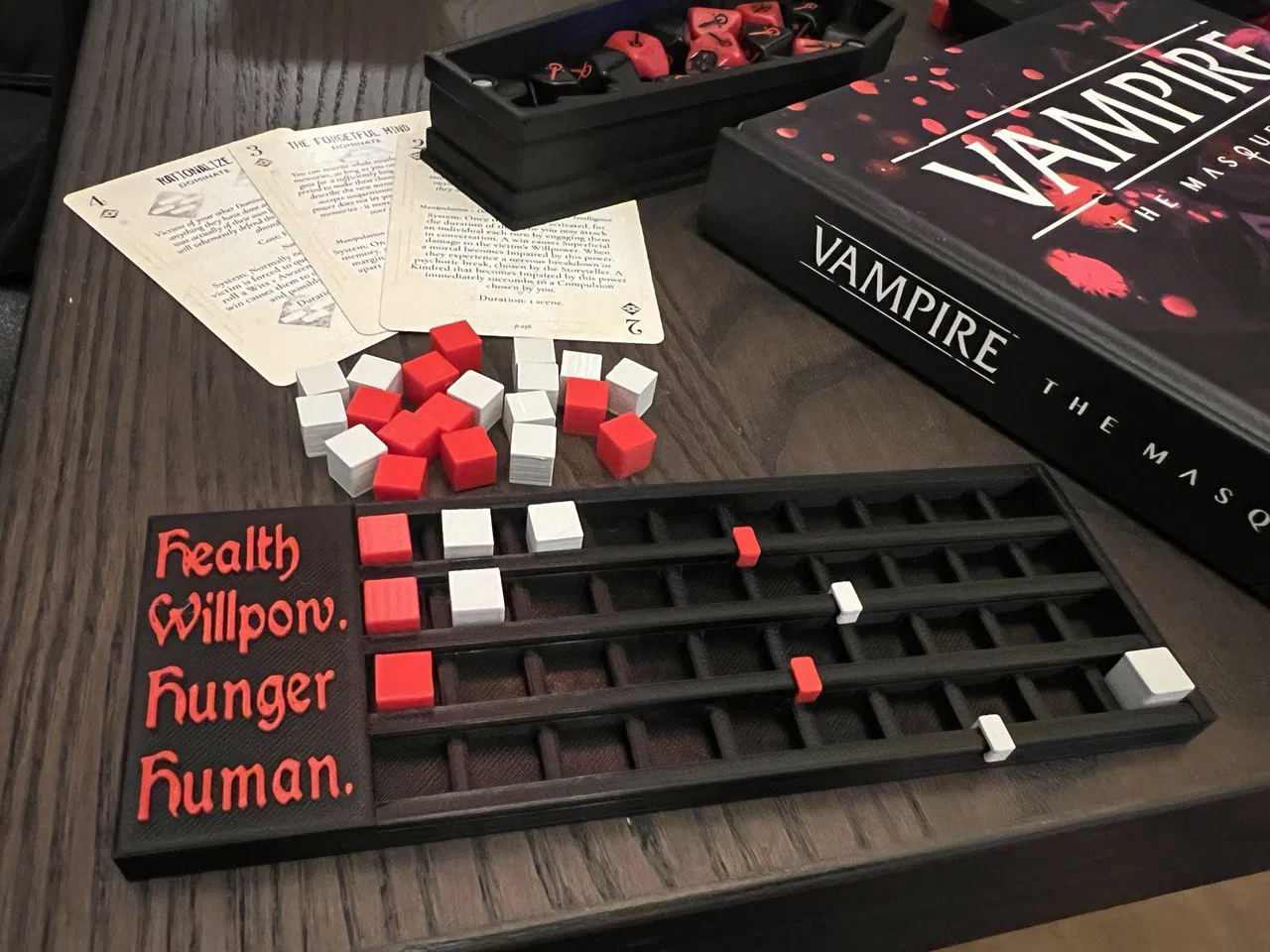 Bộ theo dõi sức khỏe, đói, nhân tính và ý chí cho hệ thống Vampire the Masquerade (v5). Giúp bạn ghi lại những thay đổi chỉ số trong game dễ dàng hơn thay vì ghi chép tay.