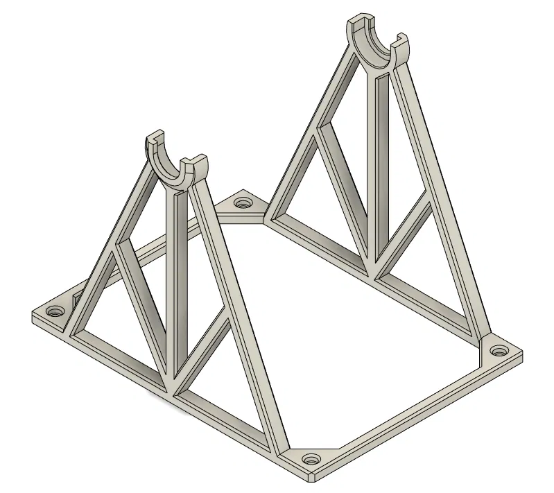 Tui thích cái kiểu dáng của "Roller Spool Holder" nhưng mà tui cần in một vài cái và lại hết nhựa in, nên tui quyết định làm lại một cái phù hợp với mấy cái nắp và ống PVC mà tui đã có, nhưng chỉ tốn khoảng 60% lượng nhựa cần thiết (làm mọi thứ mỏng hơn và cắt bớt mấy góc). Cái lỗ để bắt vít xuống thì đường kính là 4mm nên bạn có thể dùng ốc m3, m4 hoặc 1/8, dù tui nghĩ là tui không có gắn chúng vào đâu hết.