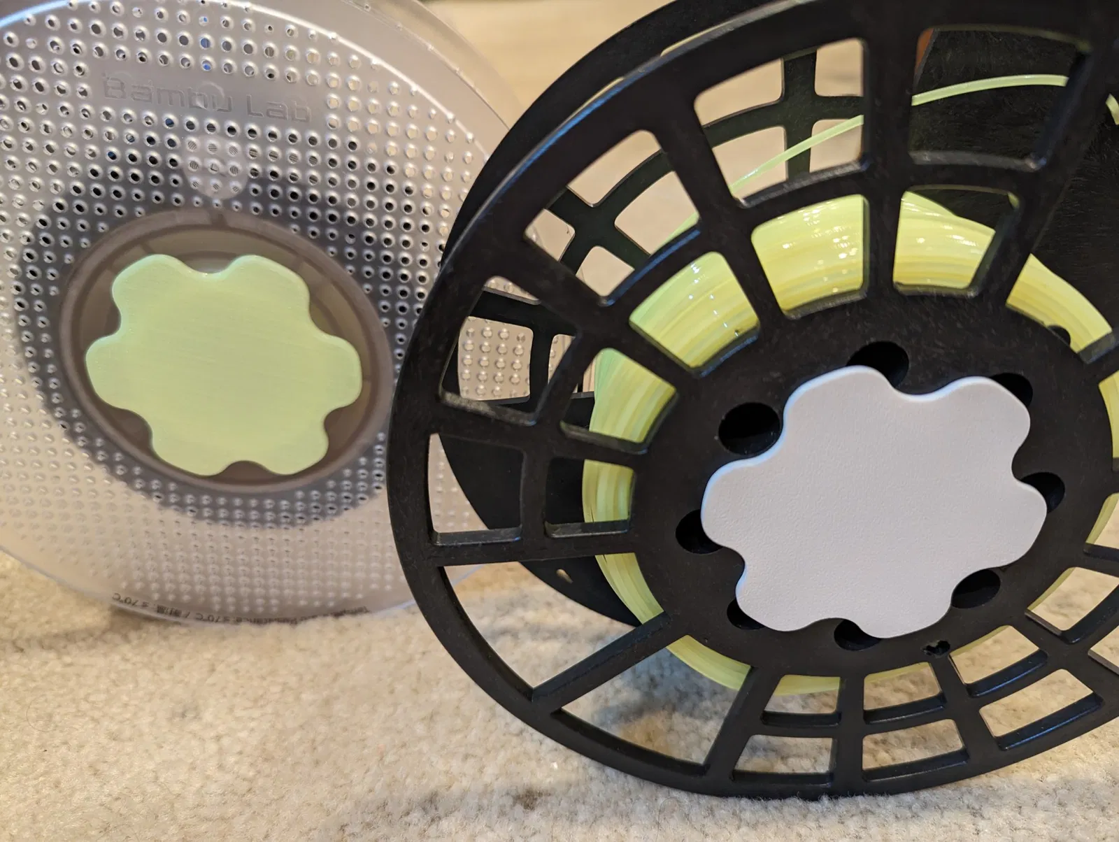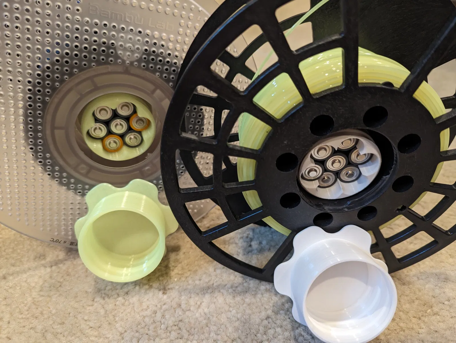 Cái này được thiết kế để giữ 7 viên pin AA (hy vọng là đã chết). Hai nửa được vặn lại với nhau qua lỗ/trục trung tâm của cuộn filament của bạn. Nên thêm đủ trọng lượng vào các cuộn gần hết để cho phép chúng được sử dụng trong AMS mà không bị kẹt, lệch chỗ, hoặc bị chế giễu vì là một kẻ yếu đuối.