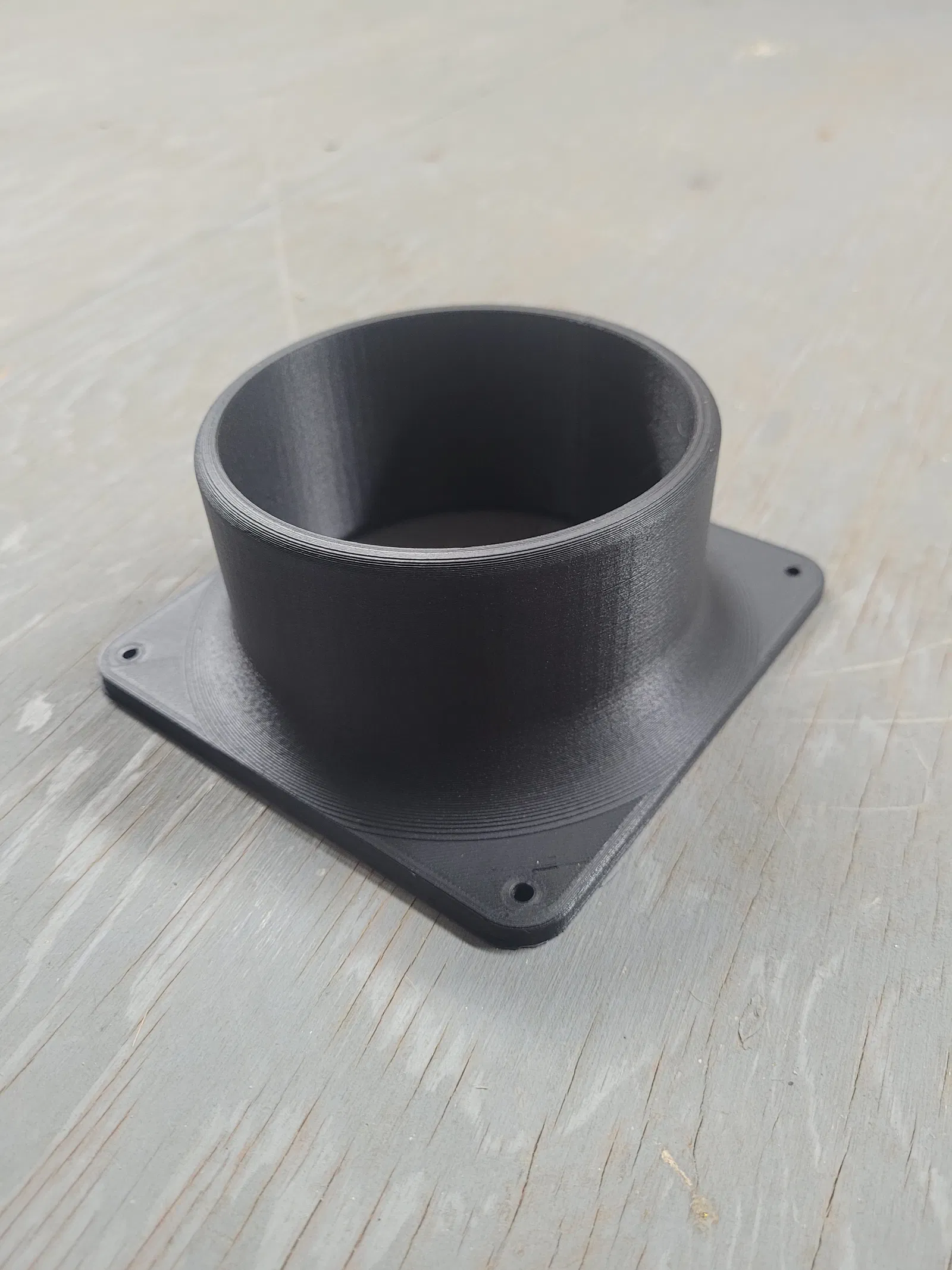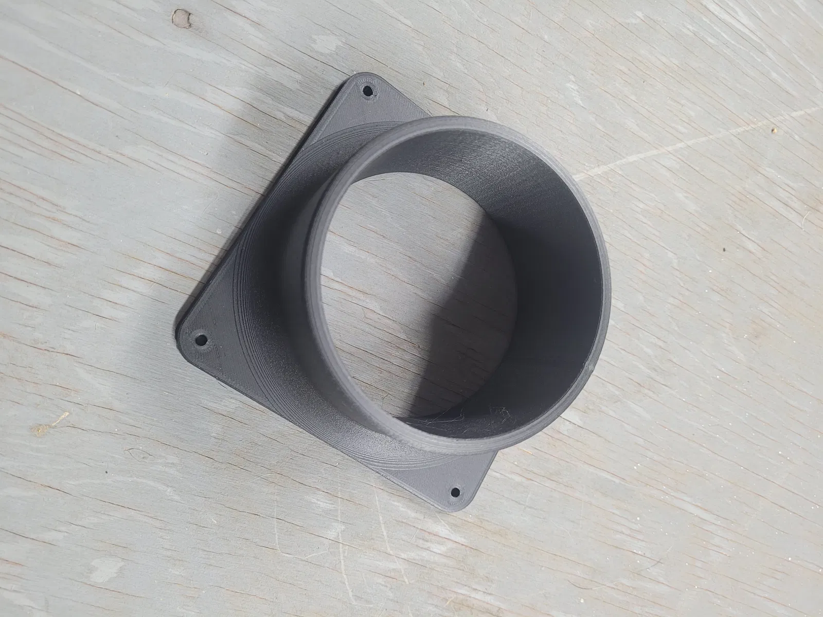 Một cái măng xông cho ống HVAC 4in, thường thấy trong các hệ thống thủy canh. Các ốc vít gắn được bố trí để vừa với quạt PC 120mm.