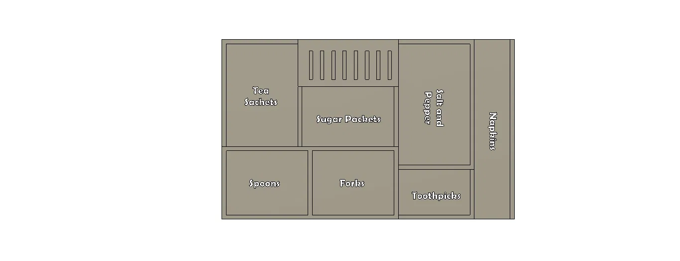 Tổ chức mọi thứ trong bếp của bạn vào một chỗ! Chiếc hộp đựng đồ này rất hợp để dùng trong bữa sáng, giờ trà hay cà phê. Có chỗ đựng gia vị, gói trà, đường, tăm, muỗng, nĩa và khăn ăn. Thiết kế này không cần giá đỡ khi in.