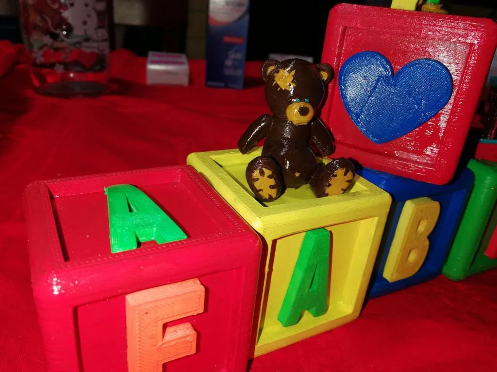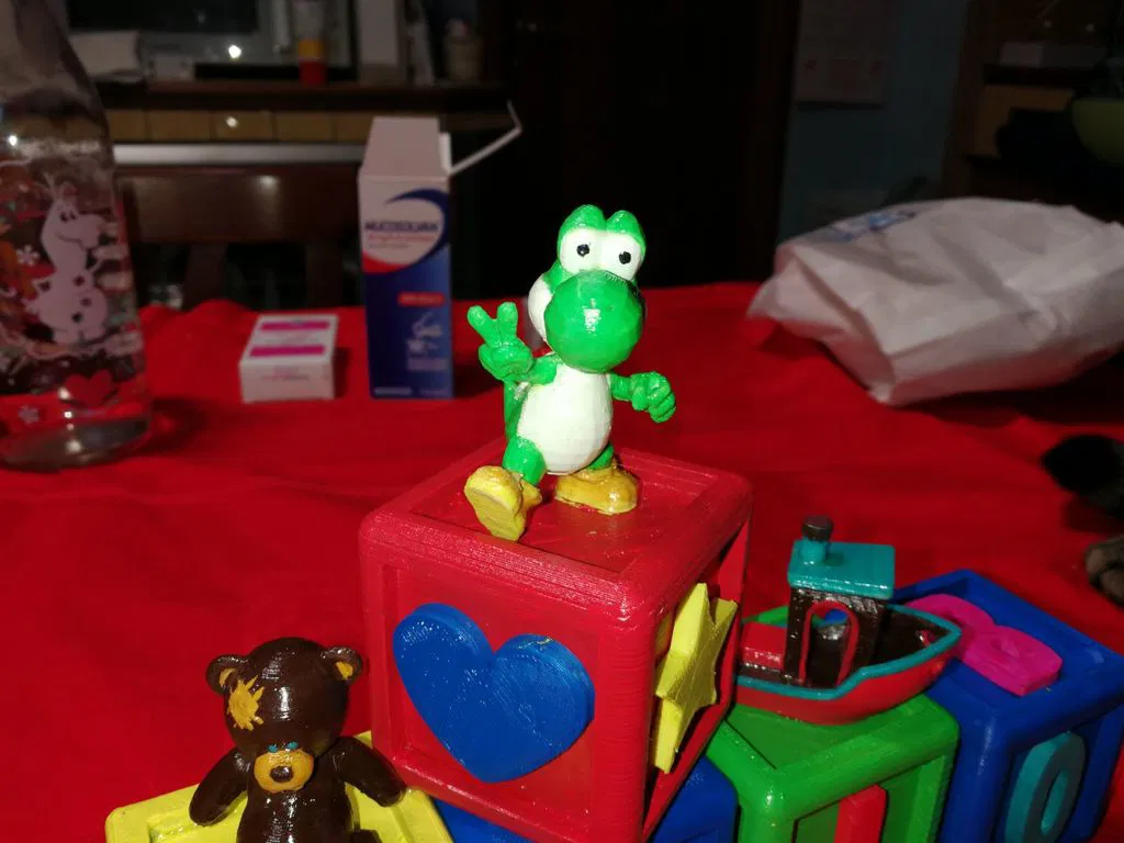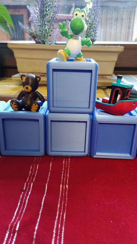 Mấy cục cube đồ chơi này là quà tui làm cho đứa cháu mới sinh của bạn tui đó, nó là sự kết hợp giữa mấy cái tui tự thiết kế trên Fusion360 cho dễ làm với mấy món tui kiếm được trên Thingiverse như con 3DBenchy với con yoshi xinh xắn.
