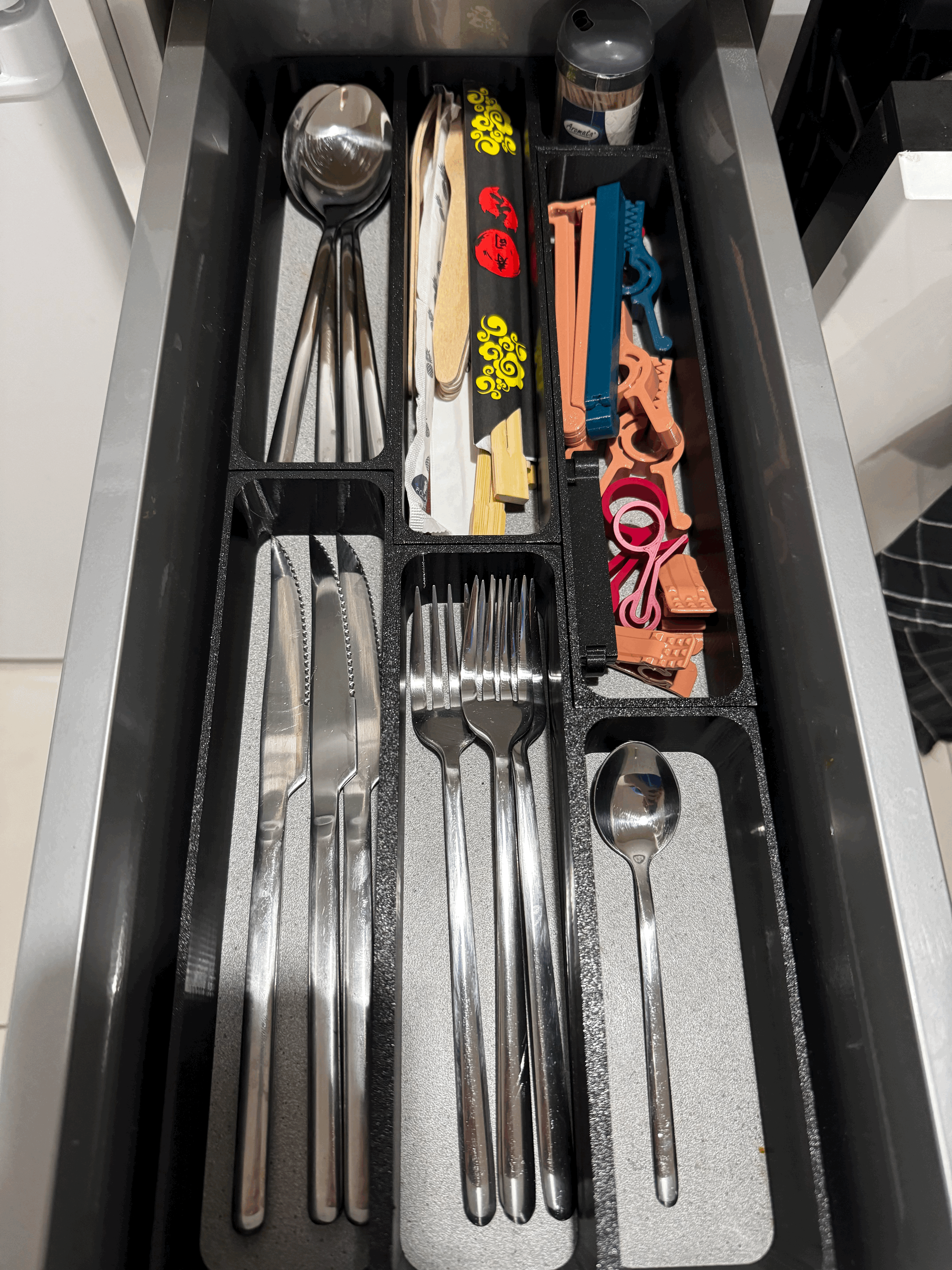 Khay chia muỗng nĩa gồm 3 món, thiết kế cho các ngăn kéo bếp nhỏ có kích thước 30x60cm. Sản phẩm này là giải pháp tuyệt vời để sắp xếp không gian bếp hiệu quả, đặc biệt phù hợp với những ai có căn hộ nhỏ. Bạn có thể tùy chỉnh chiều cao sản phẩm bằng file CAD để phù hợp với ngăn kéo nhà mình.
