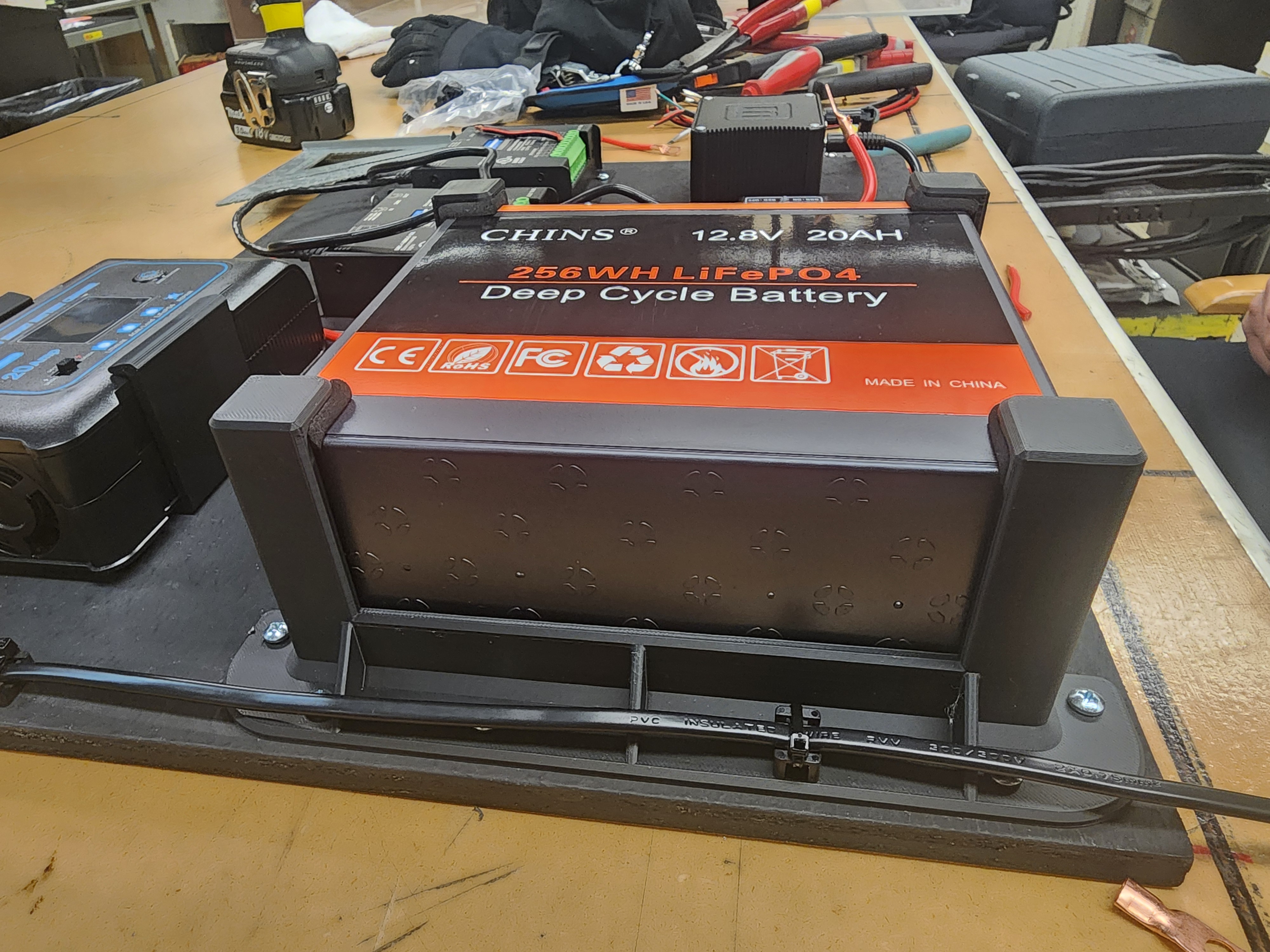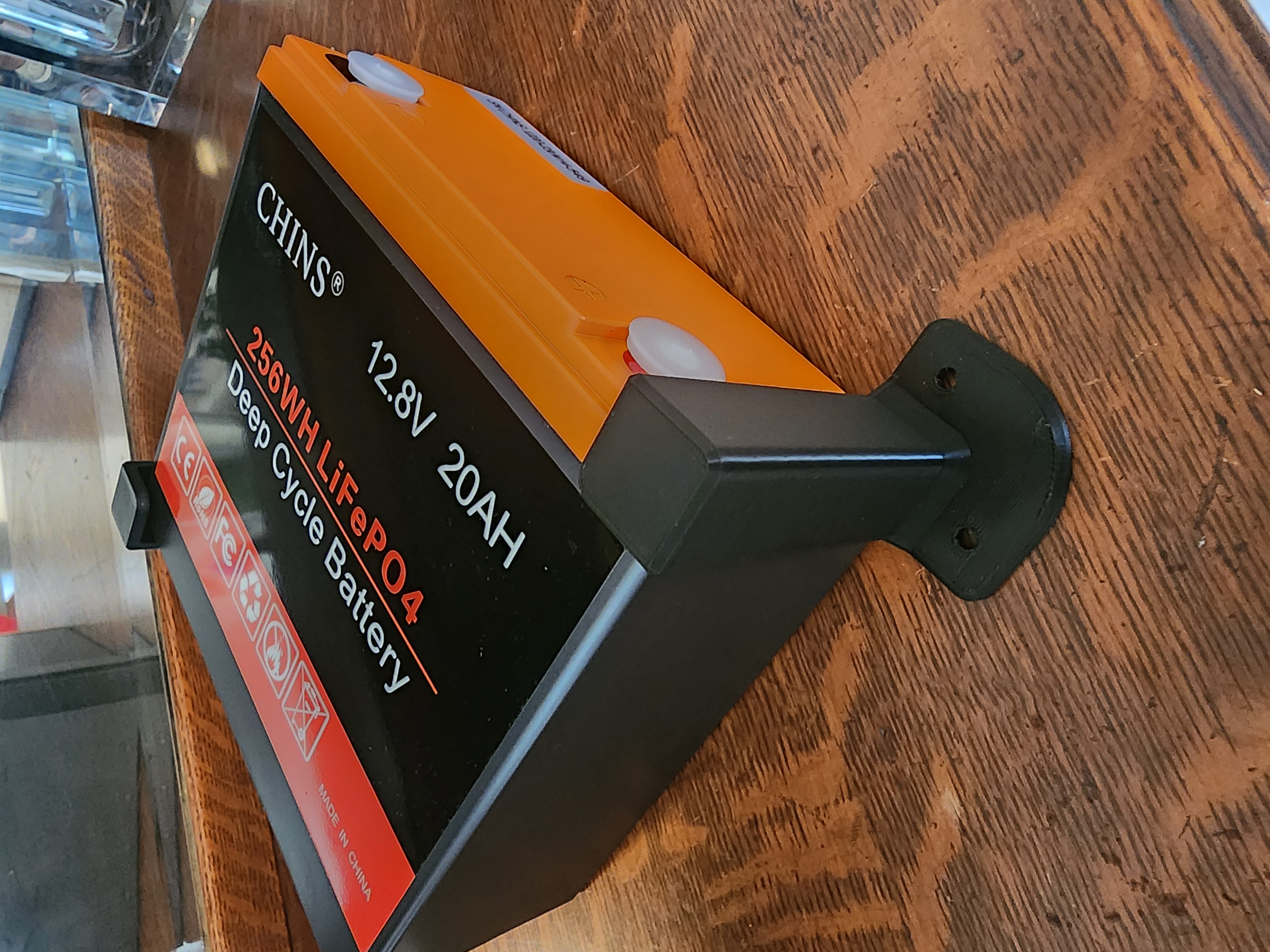 Giá đỡ pin để cố định Pin Lithium CHINS LiFePO4 12V 20AH theo chiều dọc. Ban đầu tôi đã làm giá đỡ để giữ pin nằm ngang, nhưng cũng cần giữ pin theo chiều dọc và đây là lúc mẫu này ra đời. Tôi đã sử dụng 2 giá đỡ ngang nối với nhau bằng một kệ có thanh giằng để chịu trọng lượng và hỗ trợ pin. Phần trên được cố định bằng 2 giá đỡ ban đầu. Các giá đỡ có khoảng hở 2mm so với pin để chừa chỗ cho một ít băng keo xốp (liên kết liên kết). Lớp xốp tôi dùng dày khoảng 6mm, lớp này tạo độ nén tốt khi vặn chặt và giữ pin chắc chắn. Mỗi giá đỡ có 6 lỗ cho vít đầu pan #8. Mẫu này được in bằng eSun PLA + theo chiều dọc có hỗ trợ.