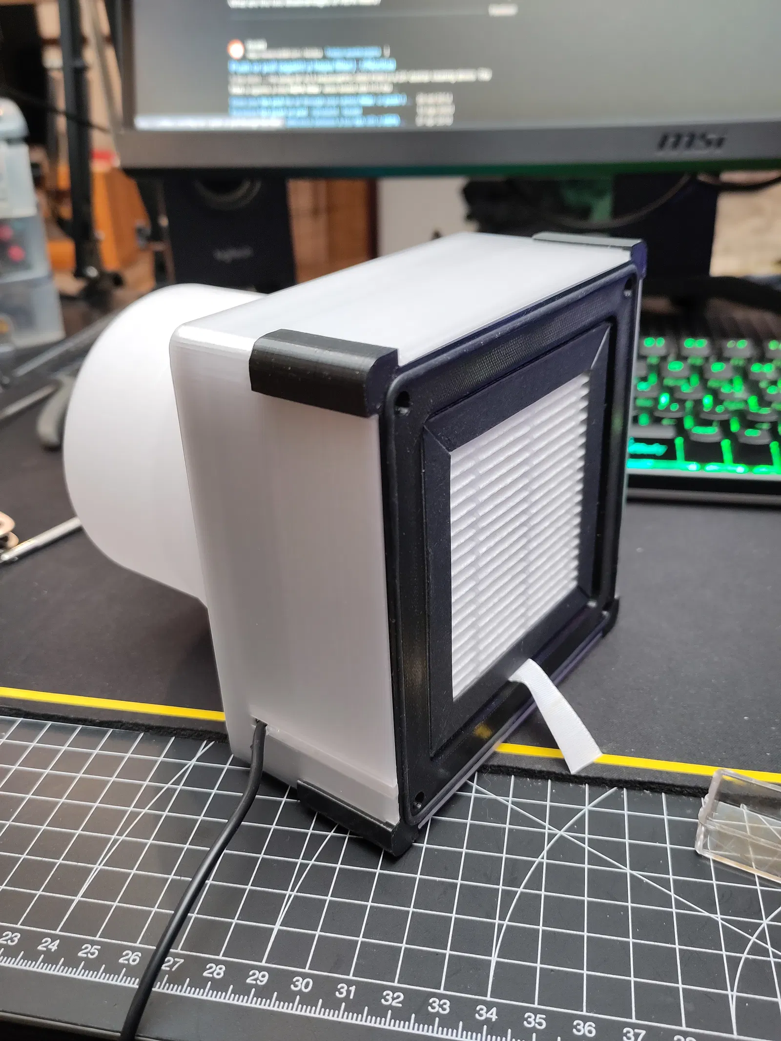 Gắn quạt 120 mm kẹp giữa ống dẫn quạt và bộ lọc hepa đi kèm với vỏ Tukkari TF theo cấu hình hút, đảm bảo không khí được hút ra ngoài và không đẩy vào bên trong vỏ.