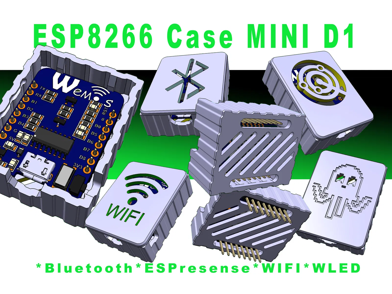Hộp đựng ESP8266 MINI D1 này không cần ốc vít, có lỗ thông gió và có thể gắn mà không cần rút bo mạch. Bao gồm vỏ có/không có đầu ra chân cắm và 4 loại nắp khác nhau cho ESPresence, Bluetooth, Wifi hoặc WLED.