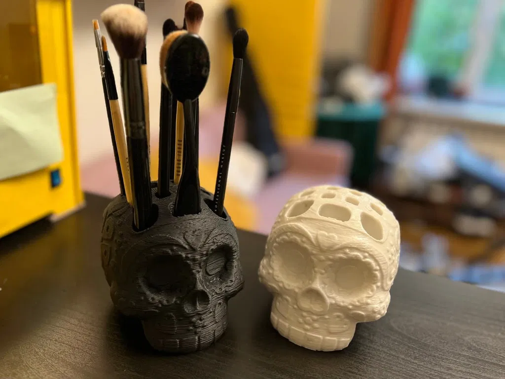 Cái đế cắm cọ trang điểm hình đầu lâu ngọt ngào này, được làm lại từ mẫu Dia de Muertos, có thể cắm được 2 cọ lớn, 1 cọ lớn tay cầm dẹp và 10 cọ vừa. Một phụ kiện xinh xắn cho bàn trang điểm của bạn.