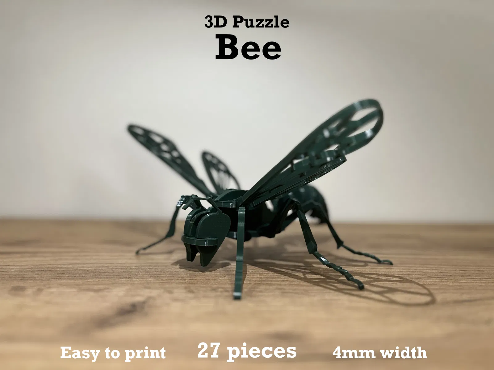 Mô hình "Ong" 3D Puzzle gồm 27 mảnh ghép, với kích thước chi tiết 4mm cho mỗi mảnh. Thông tin in chi tiết về vật liệu PLA/PETG, Infill 15% và thời gian in ~5,5 tiếng. Bản cập nhật bổ sung bộ phận cho mô hình đa sắc.