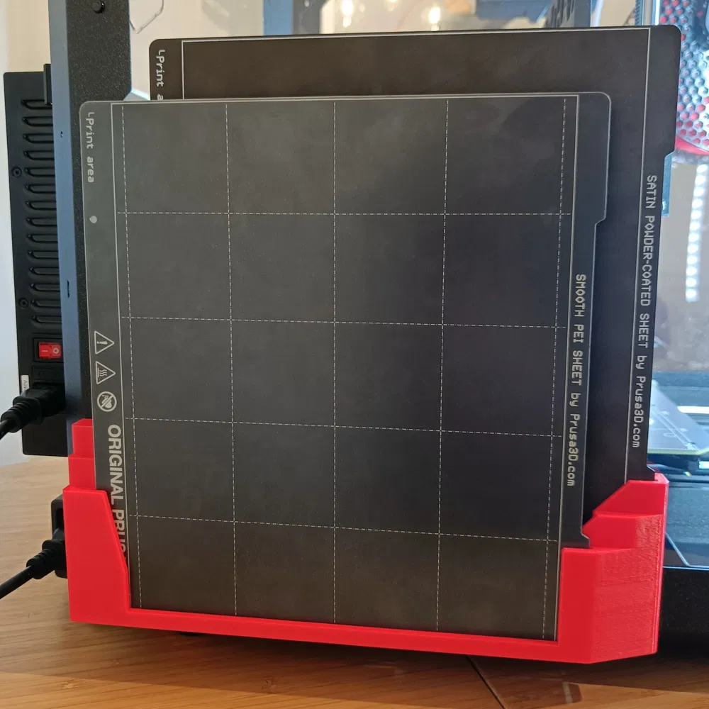 Giá đỡ kim loại cho tối đa ba tấm in MK4, gắn ngoài Hộp đựng nguyên bản. Các khe lệch ngang và dọc giúp dễ dàng truy cập, giảm trầy xước. Lắp ráp đơn giản với ốc M3, in bằng PLA với cài đặt nhanh.