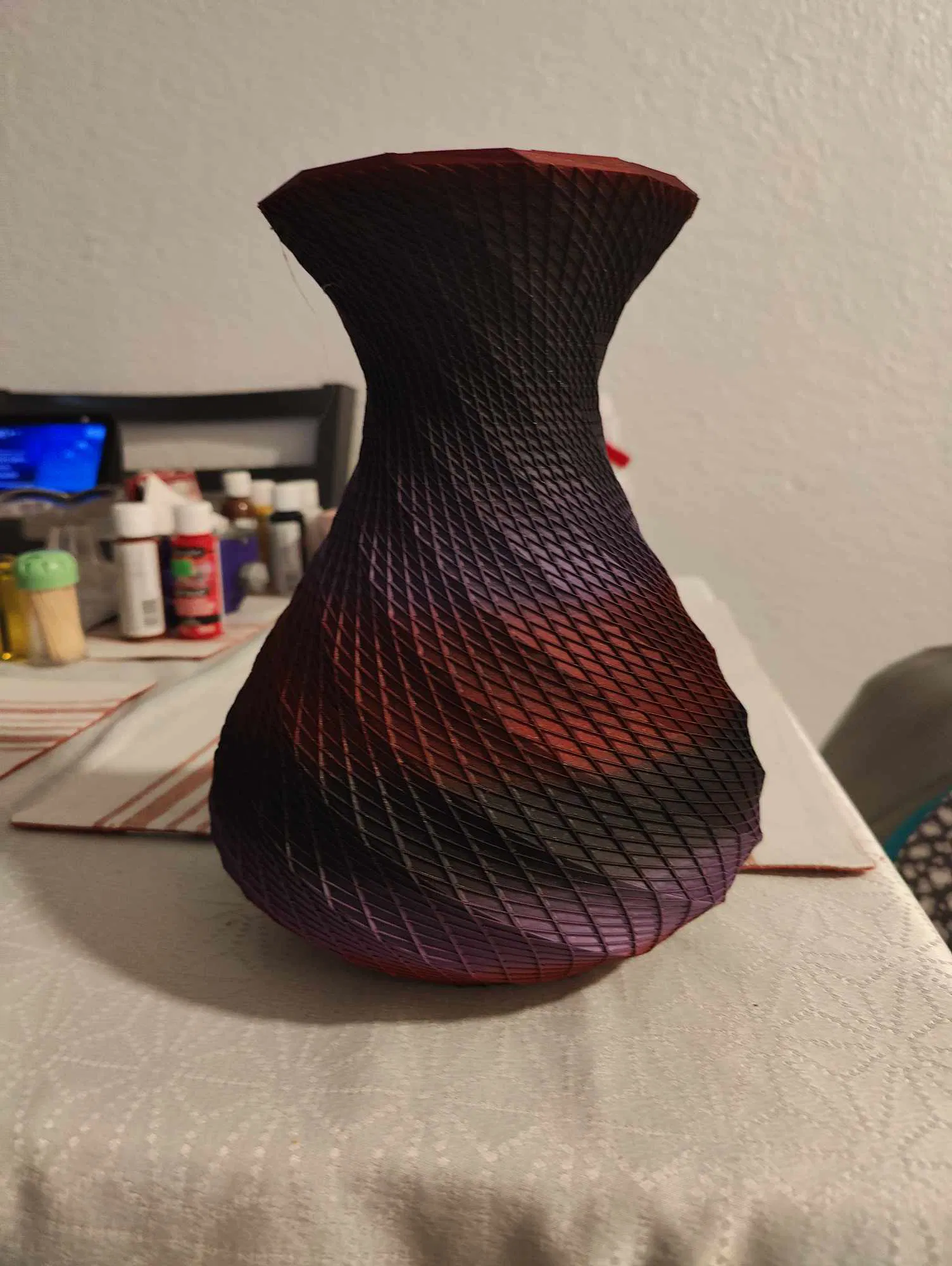 Cái bình trang trí có vân, không cần đế, in được hết trong một lần. In bằng đầu phun 0.4 mm. Kích thước cao 220 x 180 x 180 mm.