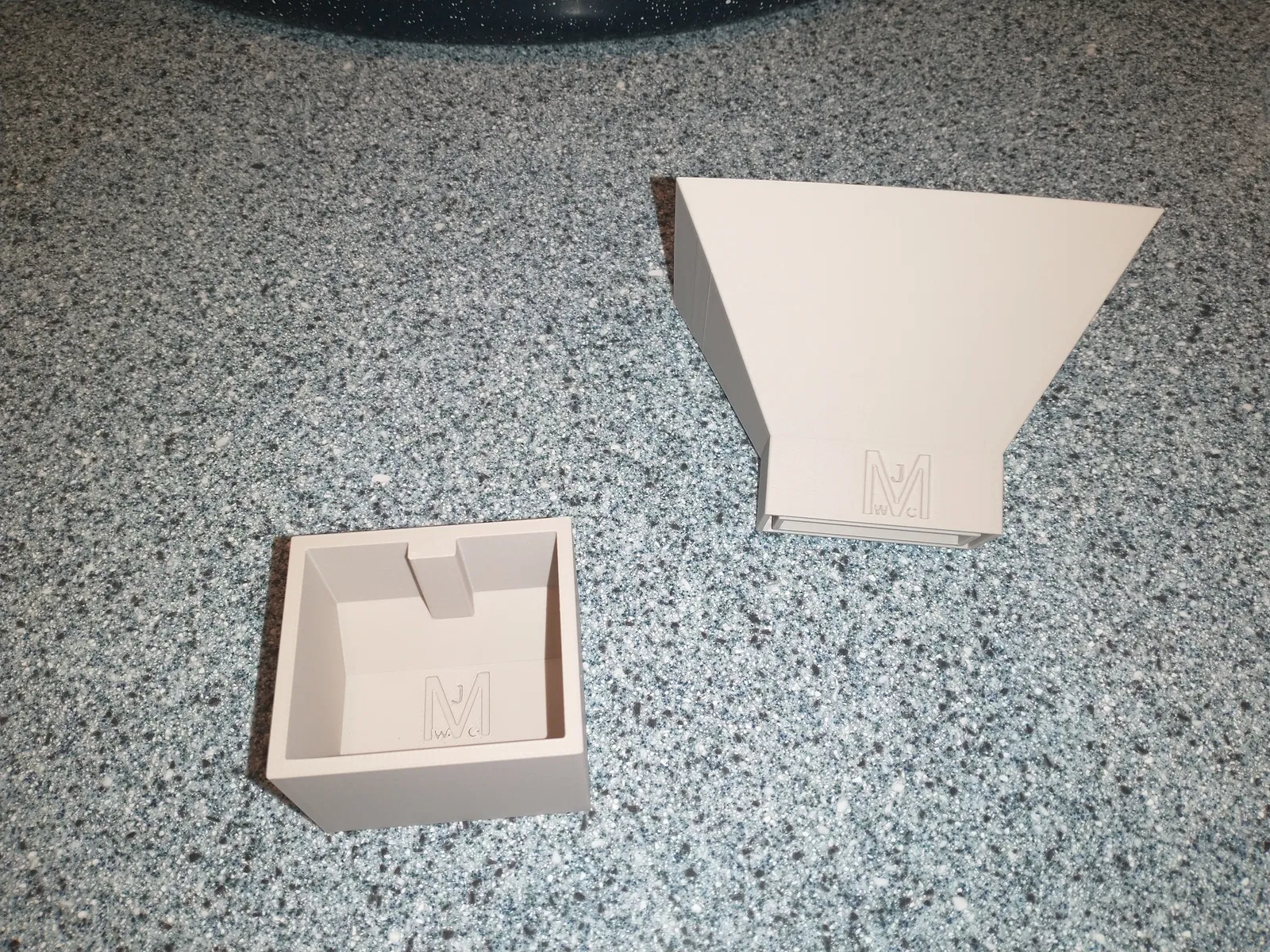 Đây là một cái đế giữ và phễu cho hộp chống ẩm khô. Cái đế giữ giúp hộp chống ẩm không bị lật, còn cái phễu được thiết kế để trượt chắc chắn lên trên. Nhìn chung, việc đổ chất hút ẩm vào hộp chống ẩm với những dụng cụ này sẽ đỡ bị đổ hơn nhiều. Cái phễu được in úp ngược để dễ in hơn. Không cần dùng đến support.