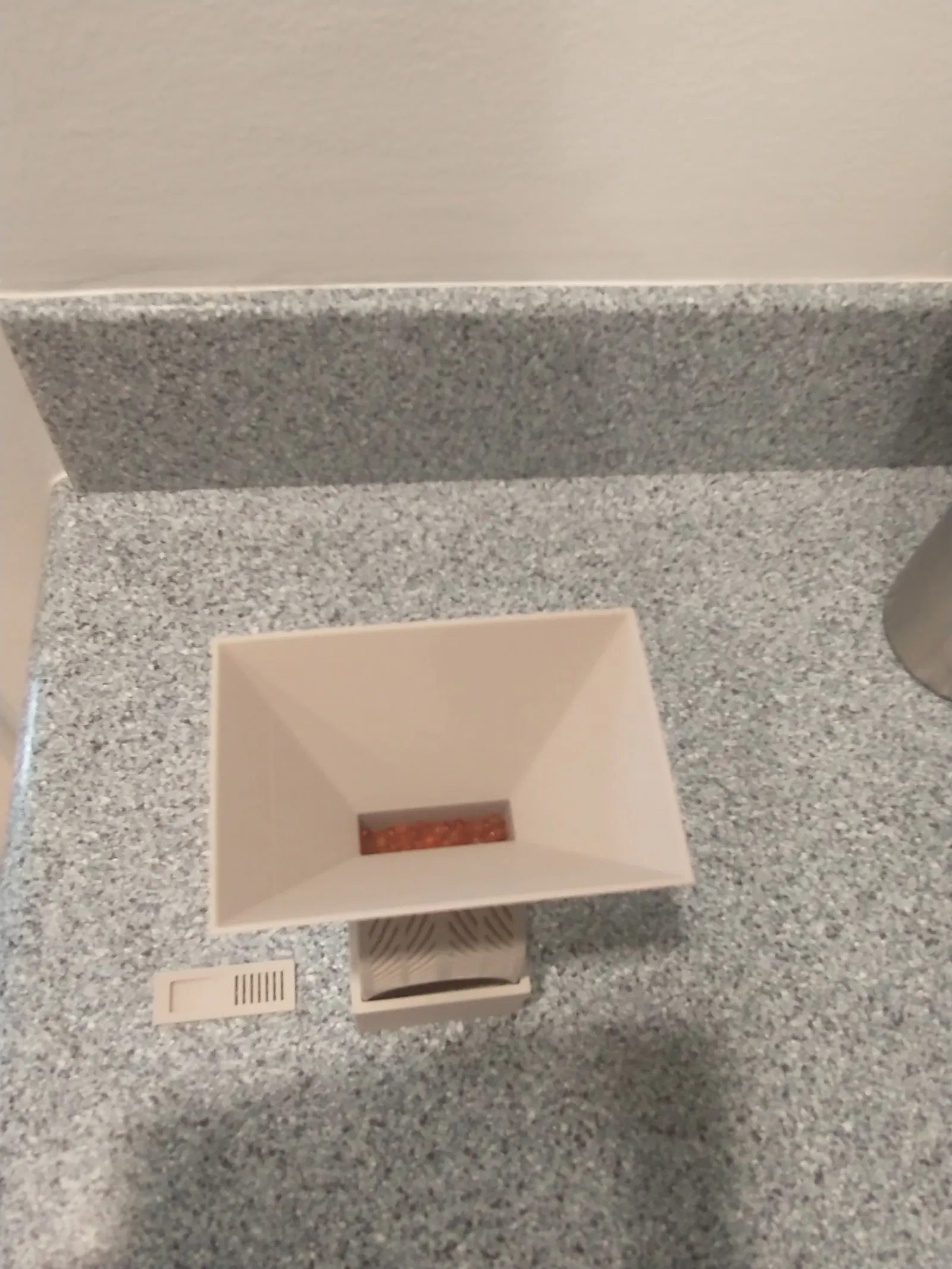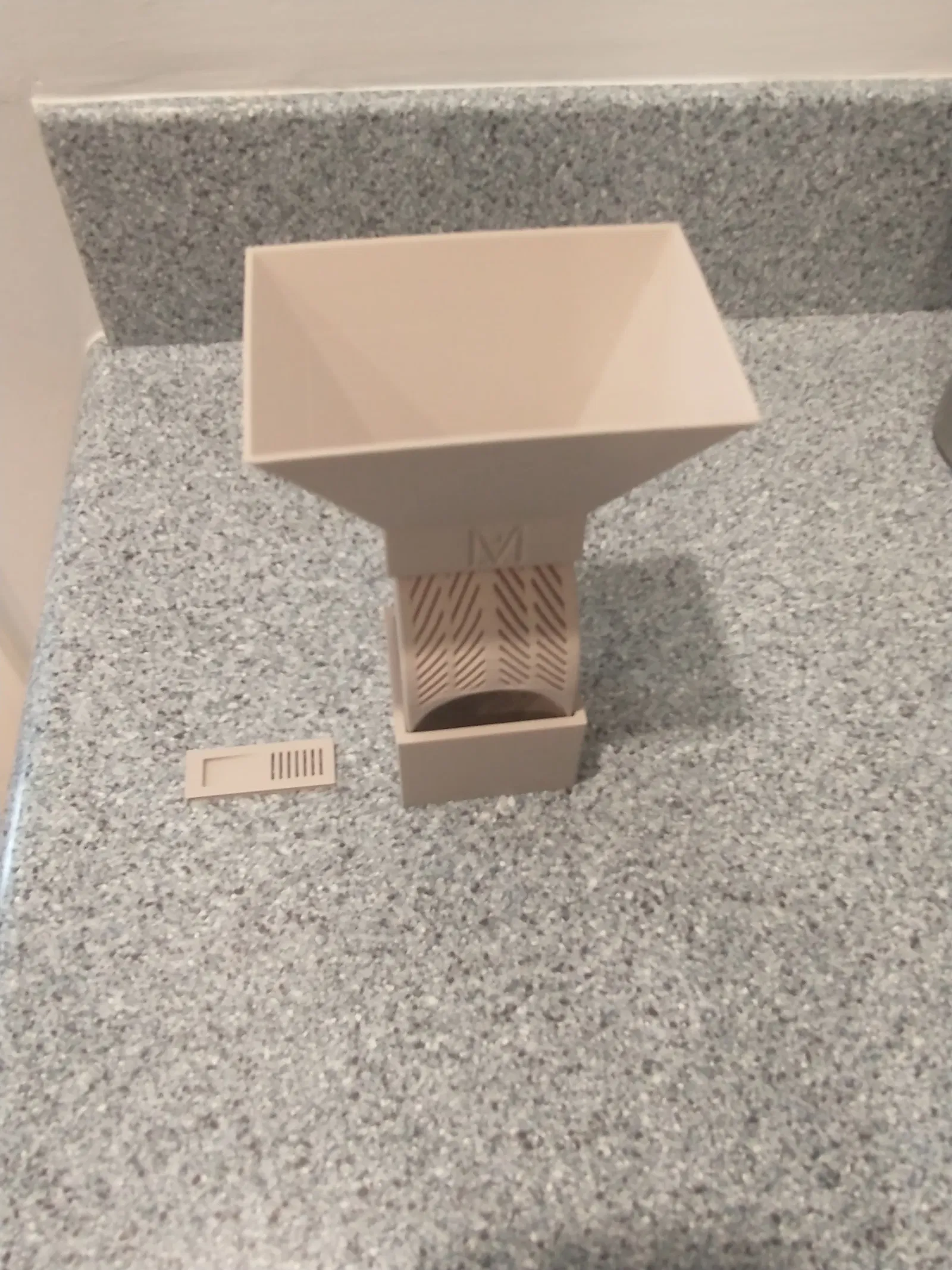 Bộ đế giữ và phễu giúp bạn dễ dàng đổ chất hút ẩm vào hộp chống ẩm khô mà không sợ bị đổ. Phần đế giữ còn giúp hộp đứng vững hơn. Phễu được thiết kế để trượt khít vào miệng hộp, việc in ấn cũng khá đơn giản, không cần support.