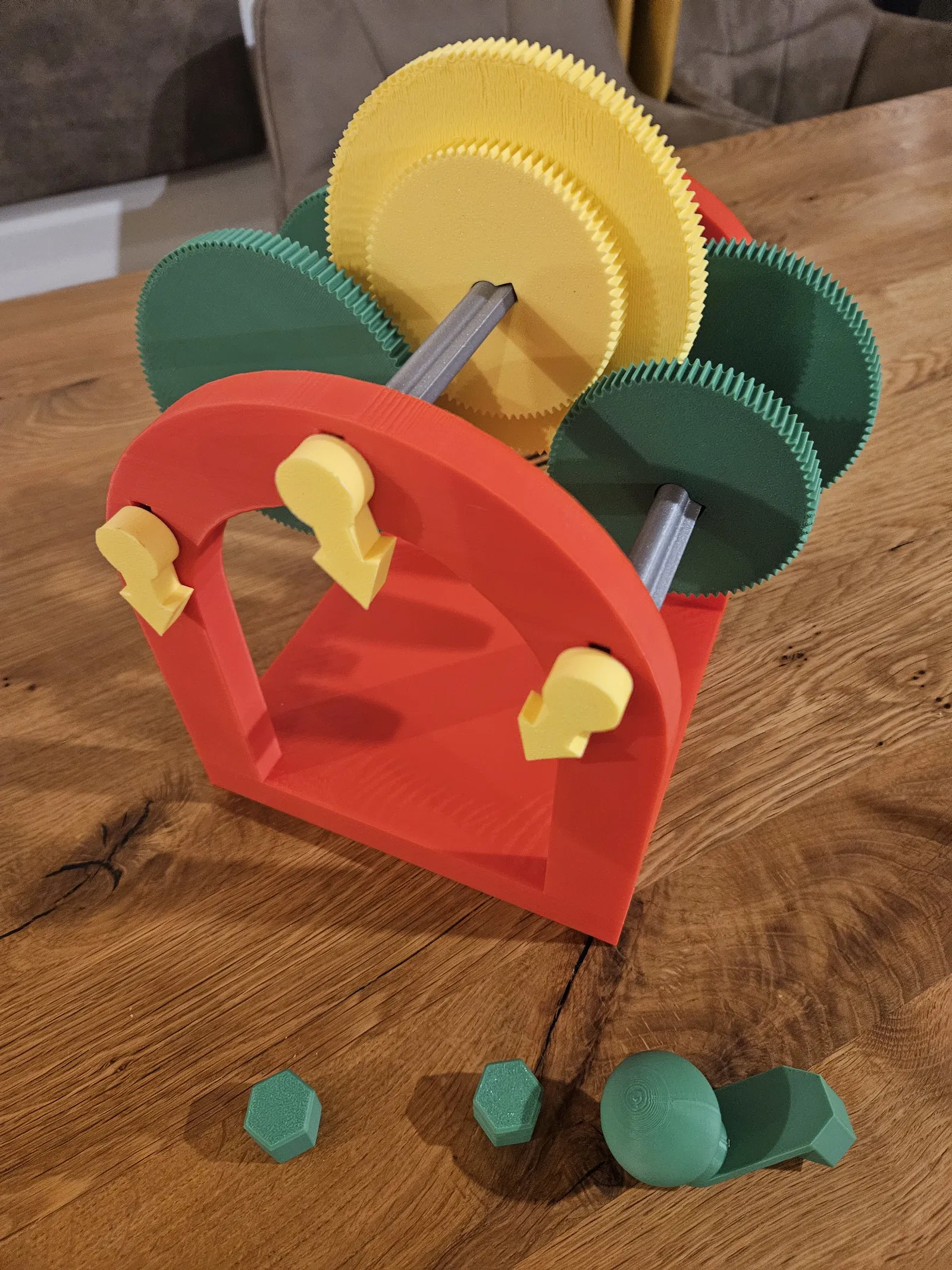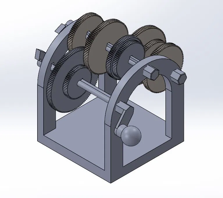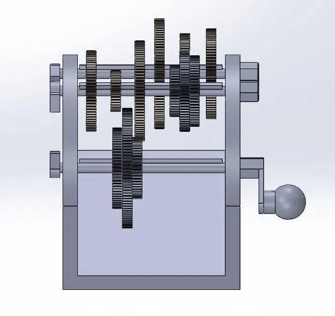 Một bộ bánh răng trượt dùng để minh họa cho cơ cấu truyền động bánh răng. Mấy cái mũi tên trên trục quay giúp thể hiện rõ hơn cách truyền động hoạt động.