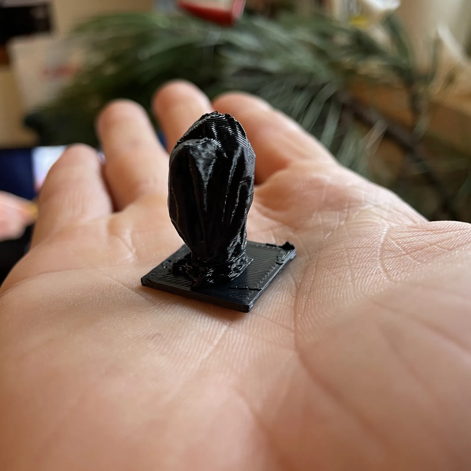 Mô hình đầu Koudelinek đặt trong túi nilon, mang phong cách điêu khắc cổ điển, gợi nhớ đến nghệ thuật Hy Lạp cổ đại. Sản phẩm này là một sự kết hợp độc đáo giữa yếu tố điêu khắc và đời sống hiện đại.