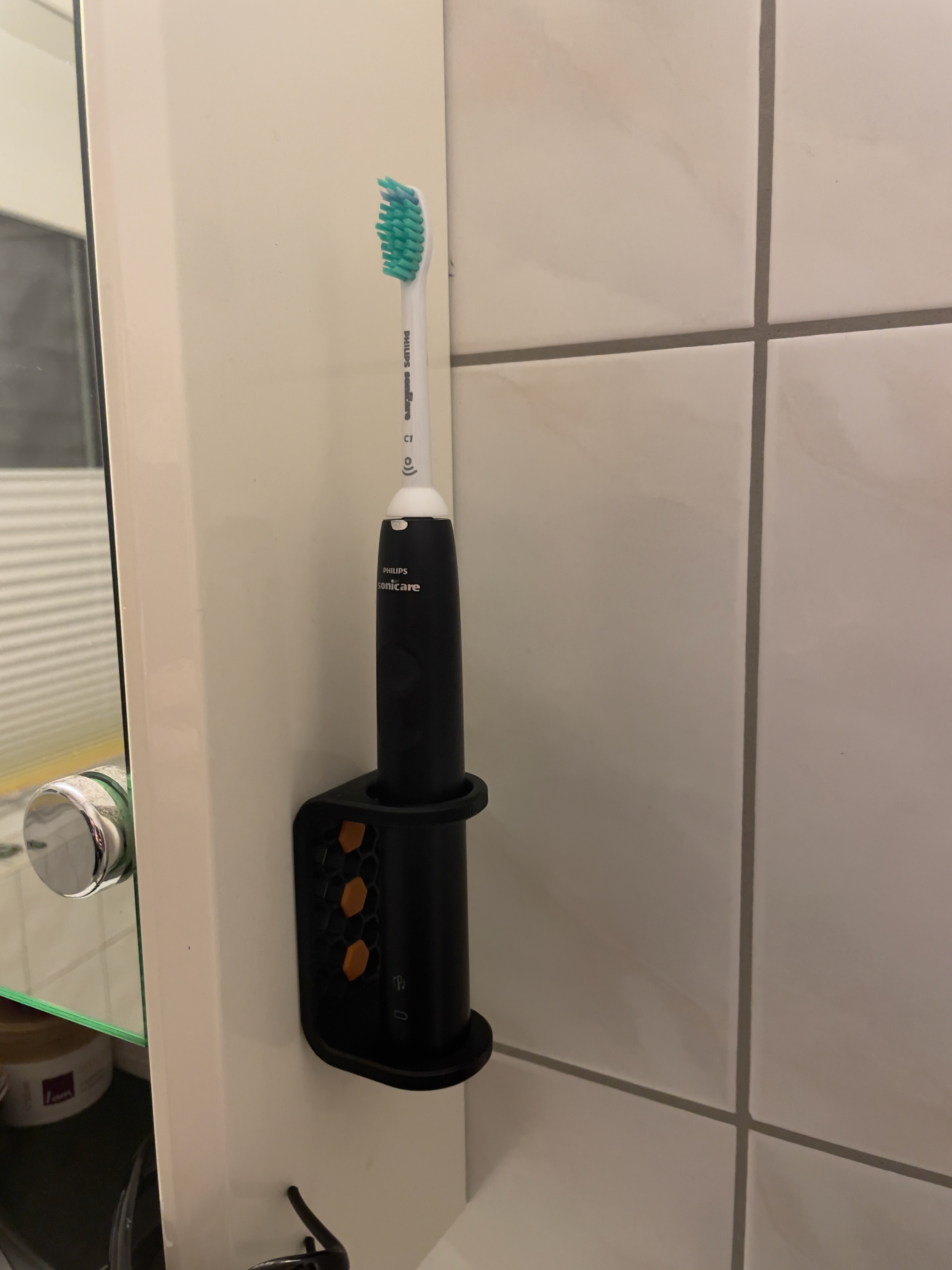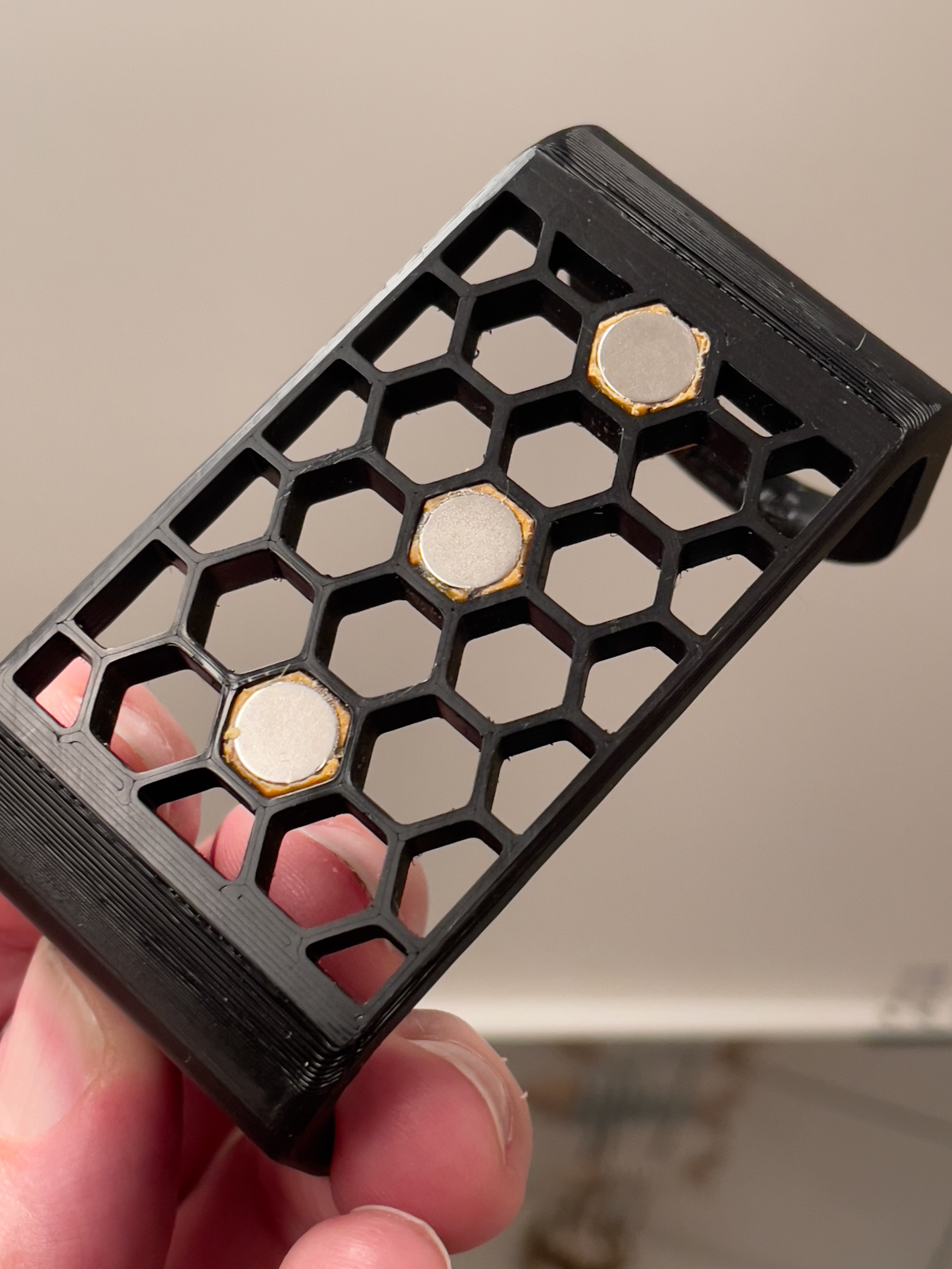 Kiểu dáng tổ ong rỗng ruột có nghĩa là mình có thể in bao nhiêu cục nam châm tùy thích, và với thiết kế này, 3 cục nam châm kích thước 8mm x 3mm là đủ để giữ bàn chải dính vào tủ rồi.