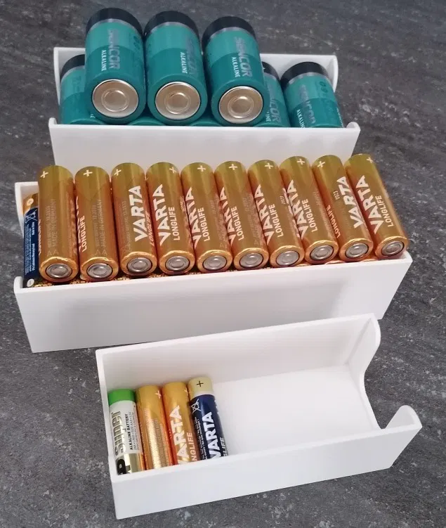 Hộp đơn giản cho pin AAA, AA, C. Đối với pin AA và AAA, có thể chứa 10 viên mỗi tầng, có thể xếp chồng 4 tầng lên nhau (tối đa 40 viên). Pin C chứa được 5 viên mỗi tầng và có thể xếp 3 tầng (tổng cộng tối đa 15 viên). In bằng PETG với độ dày lớp 0.30 mm.