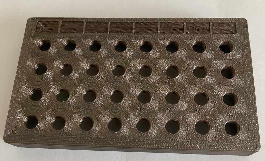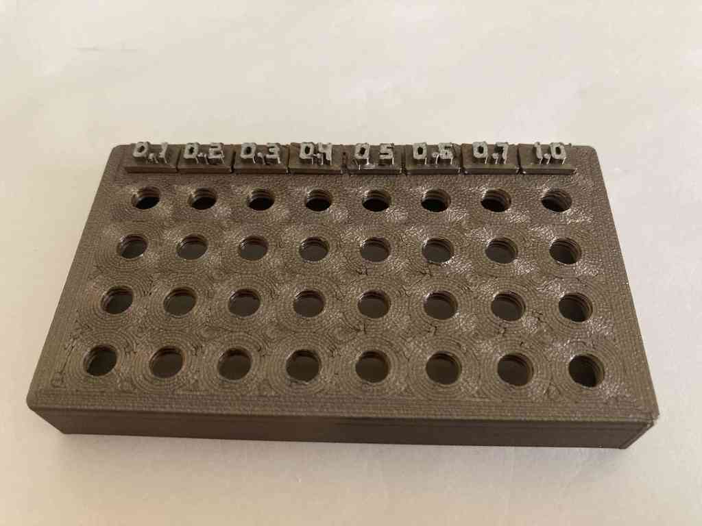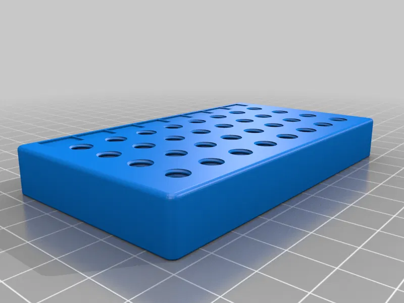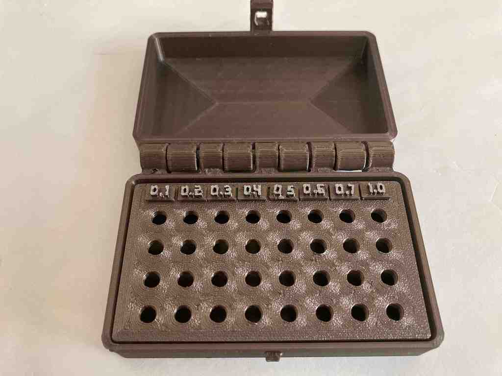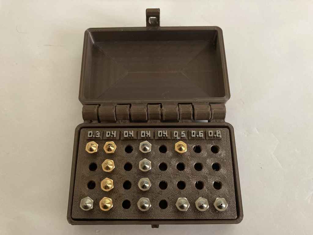 Hộp đựng được thiết kế để chứa 38 cái đầu phun (nozzle). Nắp và đáy được in cùng nhau, phần ruột có 38 lỗ ren M6 và chỗ ghi chú kích thước. Kích thước hộp 10cm x 7.5cm x 3cm, rất tiện lợi để bảo quản đầu phun của bạn.