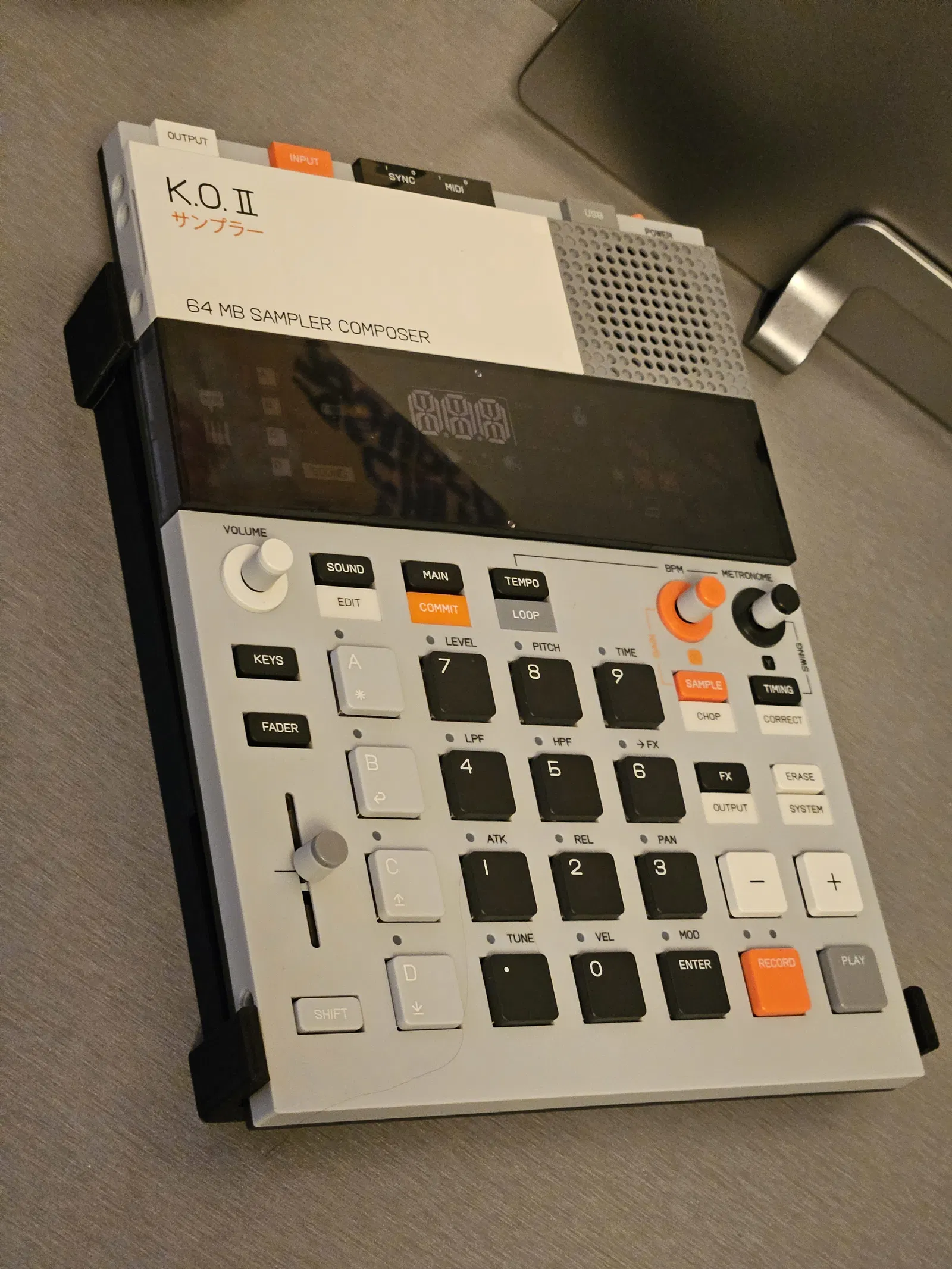 Vỏ bọc đơn giản kiêm chân đế nghiêng cho EP-133 KO II, giúp bảo vệ màn hình, núm vặn và fader khỏi hư hại. Dễ in, không cần support, có rãnh dán cao su chống trầy xước.