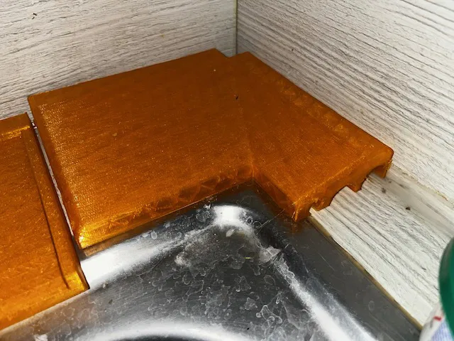 In cái này để gắn ở góc bếp tránh nước văng ra ngoài. In bằng TPU, có lỗ dưới đáy, cần support ở dưới. Nhớ in TPU chậm thôi nha.
