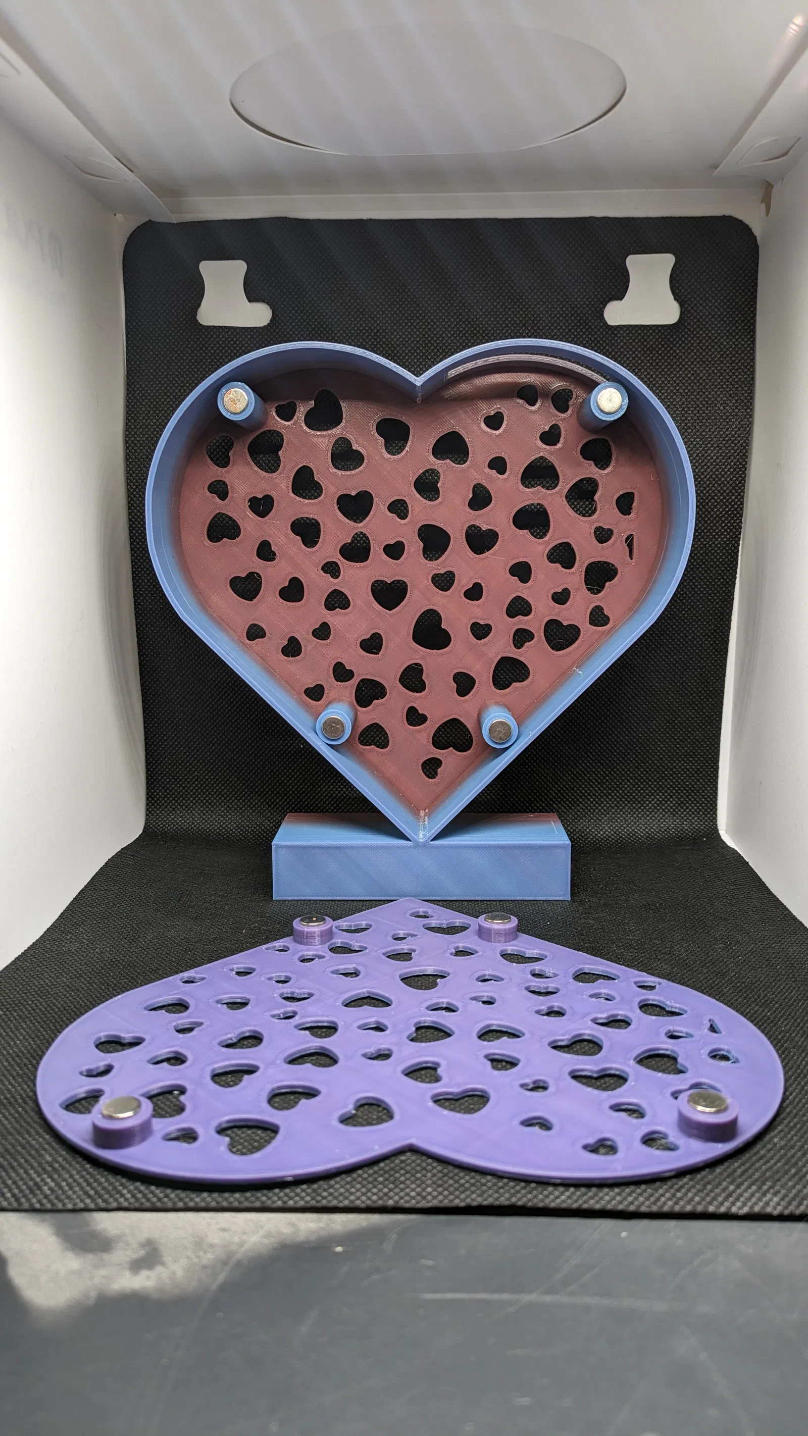 Đây là mẫu hộp đựng tiền hình trái tim, được thiết kế lần đầu bằng phần mềm FUSION 360. Mẫu in gần như không cần hỗ trợ, chỉ cần 4 viên nam châm 8mm để ghép hai nửa lại. Người dùng có thể bỏ tiền qua khe trên thân hộp.