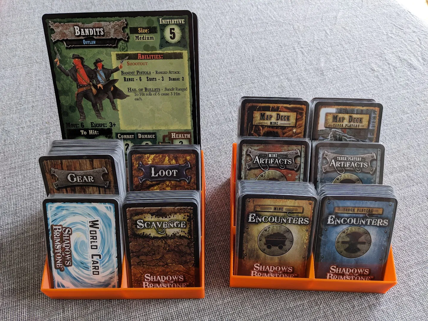 Có hai phiên bản, bản 6c chứa được 6 bộ bài thường, bài có bọc sleeve, bản 5c chứa được 4 bộ bài thường và các vật liệu lớn hơn như giấy tờ nhân vật và giấy kẻ địch của Shadows of Brimstone.