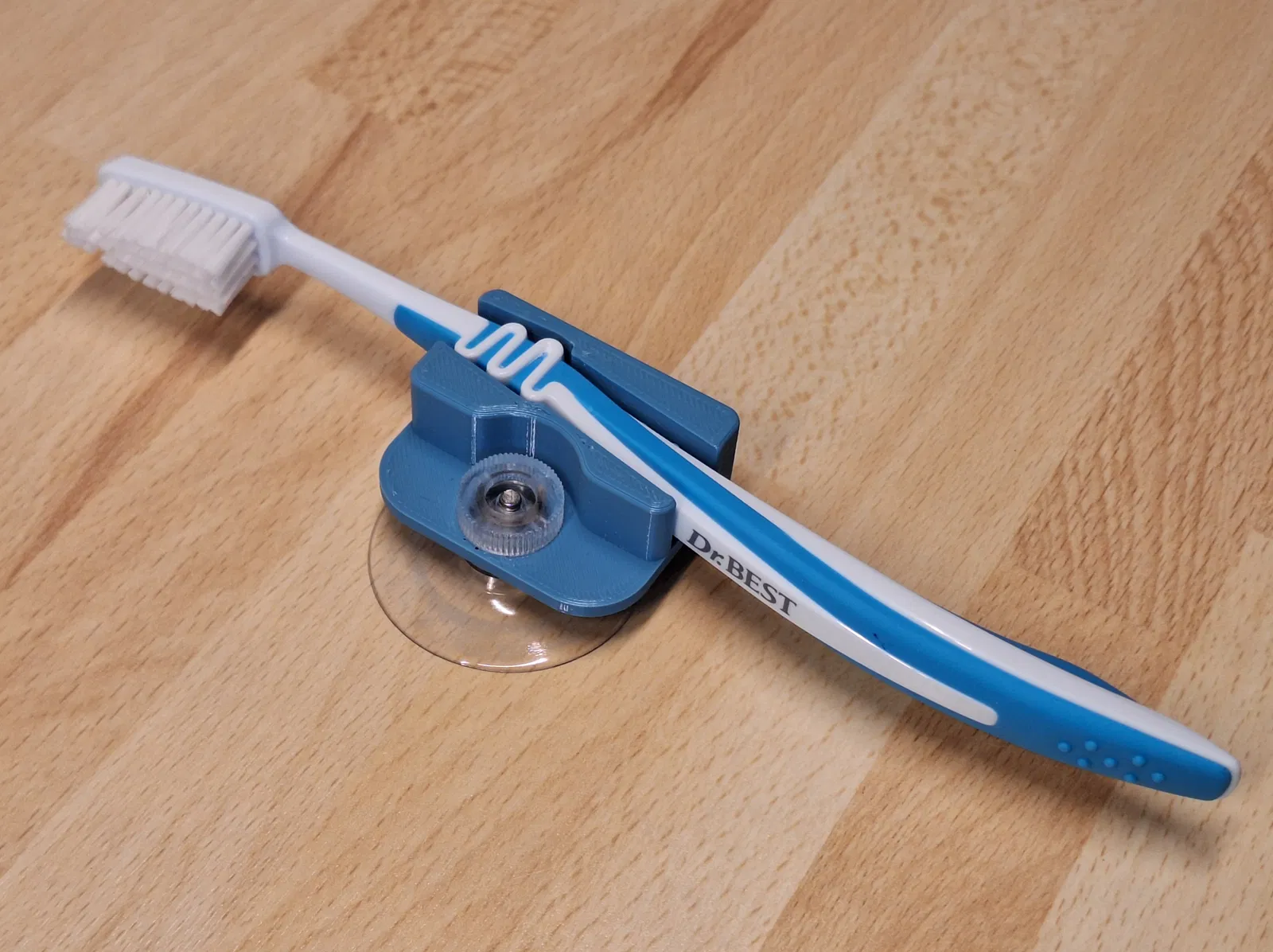 Cái cục này được làm với hình dáng chính xác để giữ bàn chải đánh răng hiệu "Dr. BEST" trên gương phòng tắm hoặc gạch men nhà bạn. Nó được làm vừa với mấy cái giác hút loại thông thường bán đầy ngoài chợ, loại có con ốc "thumb screw" 16mm.