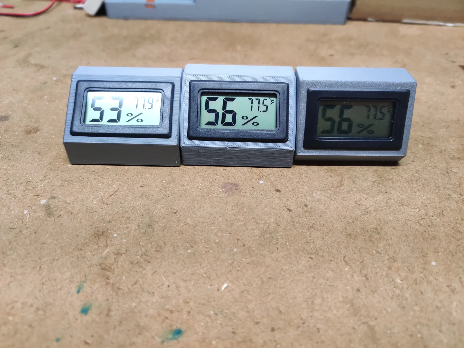 Do tui nhìn mấy con số trên cái máy đo độ ẩm không rõ lắm ở trong "thùng" máy in 3D nên tui mới chế ra mấy cái đế này cho nó.
