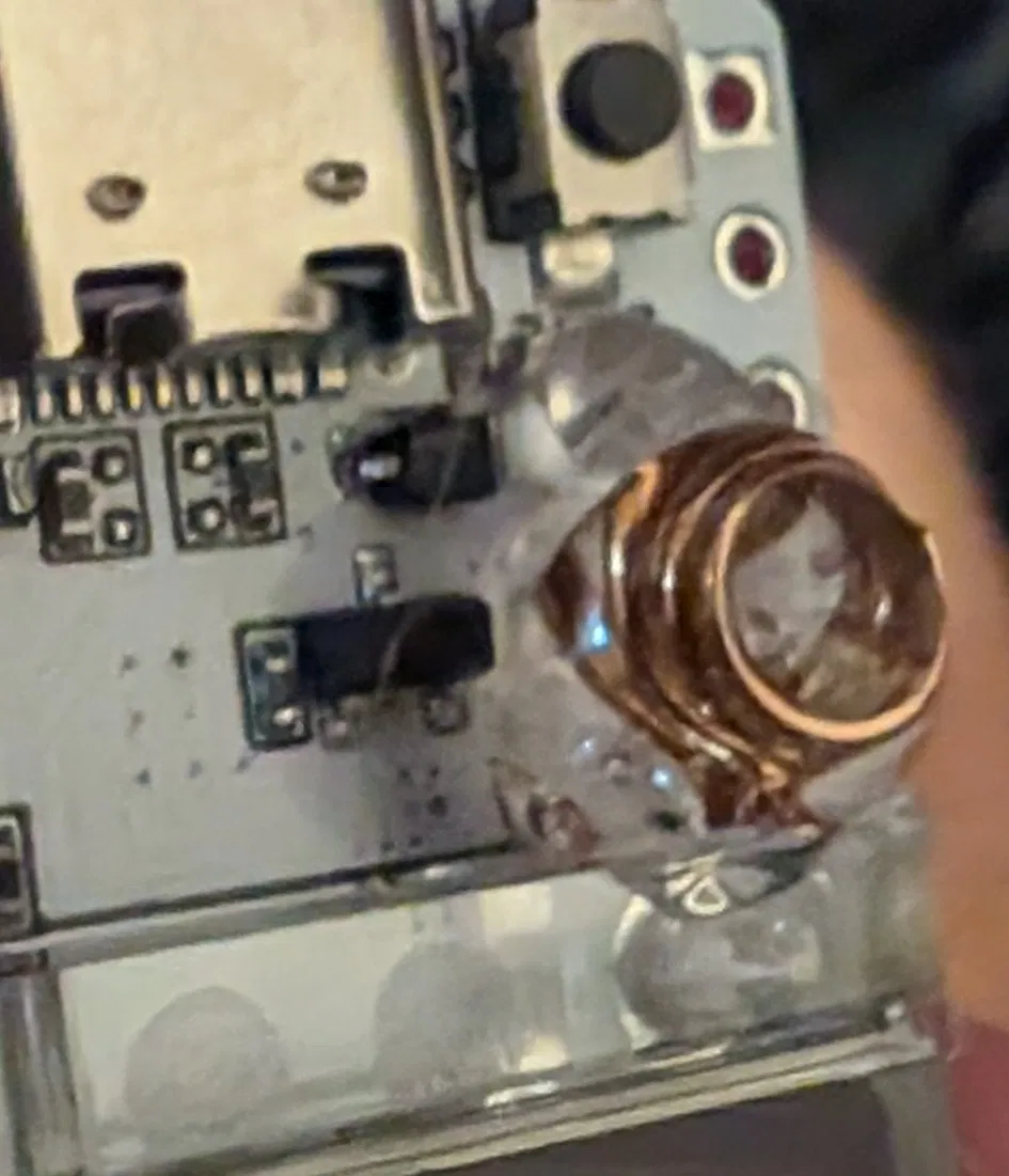 Phết keo nóng lên ăng-ten cuộn dây nhỏ để bảo vệ nó khỏi bị gãy trong quá trình lắp ráp. Phết keo nóng vào điểm giảm căng cho đầu nối SMA của cáp.